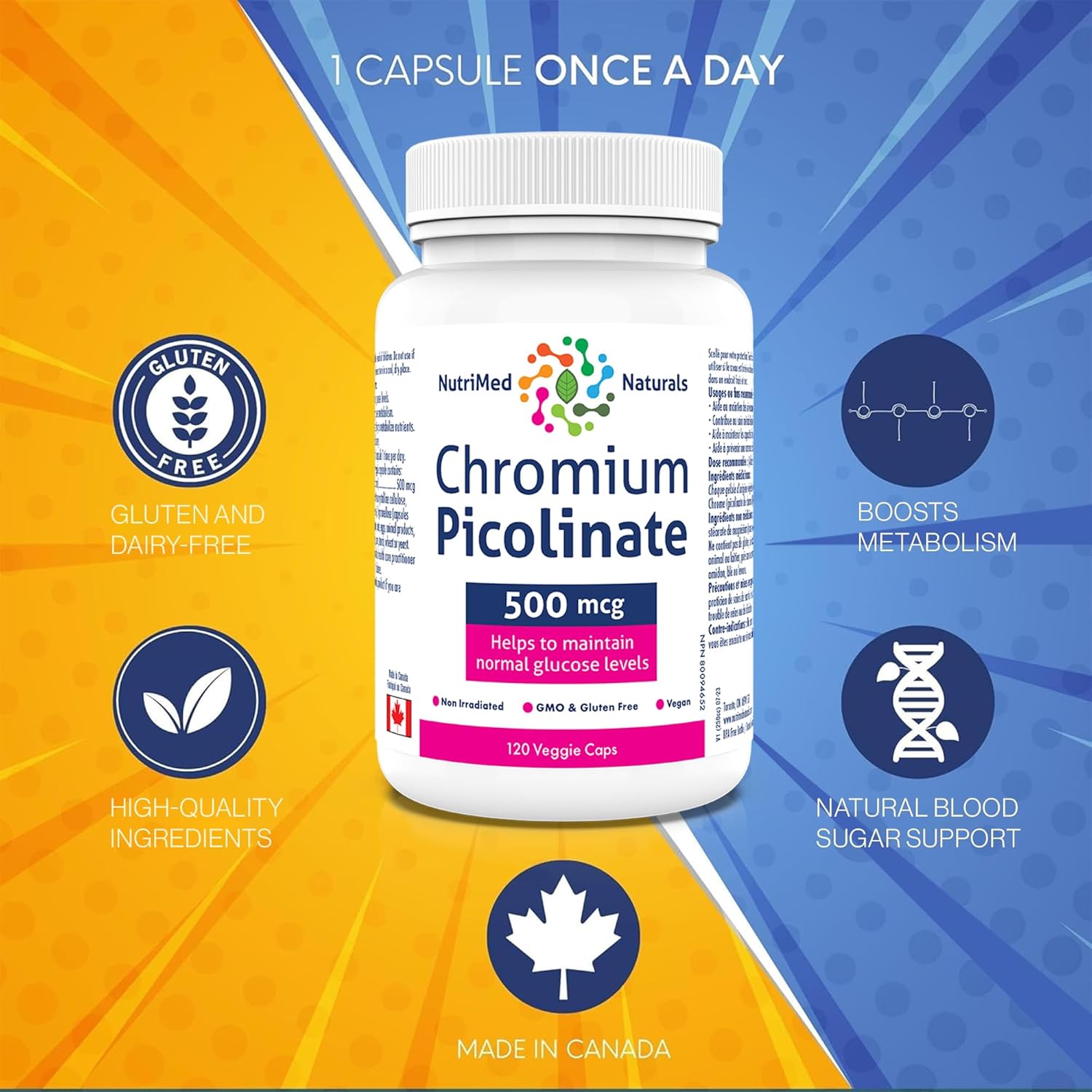 Nutrimed Naturals - Chromium Picolinate 500mcg, 120 Capsules 120-Day Supply - Glucose and Blood Sugar Support - Muscle Mass and Metabolism Support - 3rd Party Tested - Formulated & Made in Canada
