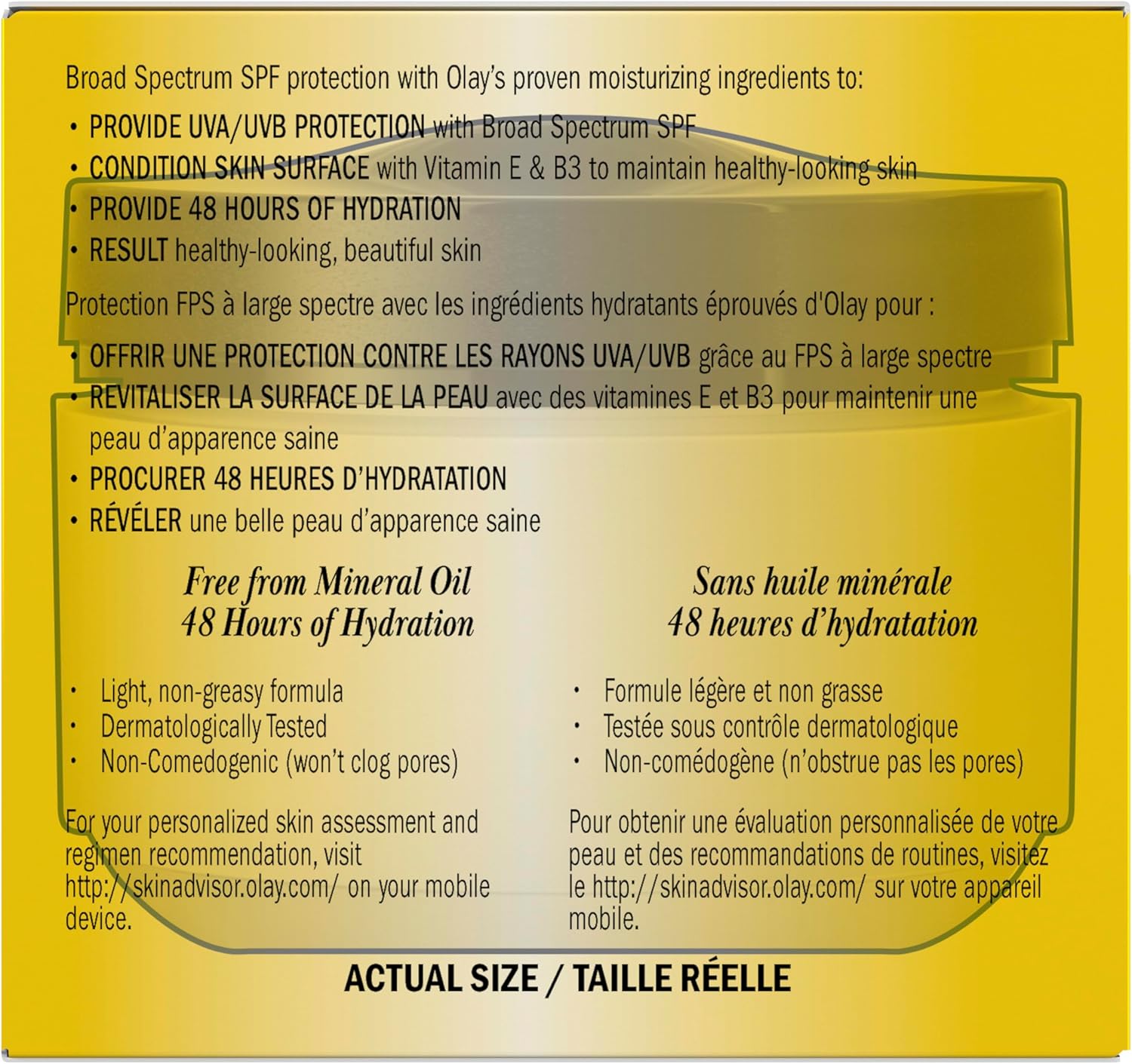 Protect against the #1 cause of aging skin—damage from the sun. Recommended by the Skin Cancer Foundation, Olay Complete Daily Moisturizer Cream with Broad Spectrum Sunscreen SPF 15 and UVA/UVB protection provides 48 hours of hydration for normal skin. This rich cream moisturizer conditions skin’s surface with Vitamins E, B3 and C to help maintain healthy-looking skin. Unlike many facial moisturizers with sunscreen, Complete All Day facial moisturizer with SPF is non-greasy and non-comedogenic—so it won’t clog your pores. Its oil-free formula leaves skin with a healthy glow. At Olay, we’re serious about our commitments. Our Olay Skin Promise to you is zero skin retouching in all advertising. Olay is the first mass skin care brand in the US to take this stance, because we know real beauty is honestly beautiful.