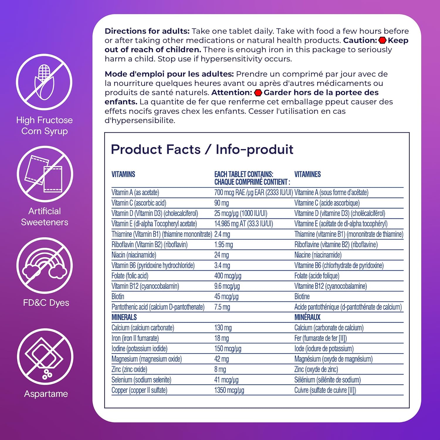 Doing it all is a little easier when you have the right support and that includes nutritional support. One A Day Women multivitamins are specially formulated for her! Let's face it: men and women are different and our nutritional needs change as we move through this amazing journey we call life. With a host of essential vitamins and minerals, this daily vitamin for women is formulated to help support her:   Muscle Function - Helps to maintain muscle function Bone Health - Helps in the development and maintenance of bones and teeth Metabolism - Helps in energy metabolism in the body Antioxidants for Good Health - Source of antioxidants for the maintenance of good health Immune Health - Helps to maintain immune function Healthy Skin and Hair - Maintains healthy hair, skin and nails Eye Health - Helps support eye health Heart Health - Helps to maintain heart muscle function   Your body may need essential vitamins such as A, B6, B12 C, D, E, riboflavin, thiamine, and niacin, and One a Day women's multivitamin tablets add 100% of the daily recommended intake for 15 vitamins and minerals*. If you don't follow a balanced diet, you may fall short in getting the vitamins and minerals you need from food alone. Taking One A Day's female multivitamin is another thing you can do to help you be your best you. Each tablet is formulated with essential vitamins and minerals you're looking for to help maintain good health, while being free of high fructose corn syrup, aspartame, artificial sweeteners and synthetic FD&C dyes. Why not make One A Day womens multi vitamin a part of your healthy lifestyle today!   *Vitamin and mineral intake levels based on Health Canada's recommended daily allowance values. Directions for Adults: Take one tablet daily, with food, a few hours before or after taking other medications or natural health products. To be sure this product is right for you, always read and follow the label.