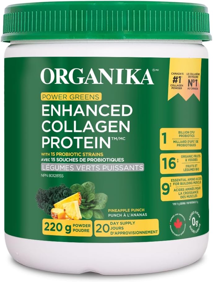 Organika Canadian-Made Power Greens with Enhanced Collagen - 16 Superfoods - Organic Fruits and Vegetables Nutrient Rich Powder Pineapple Punch Flavor with Essential Proteins and Probiotics - 220g