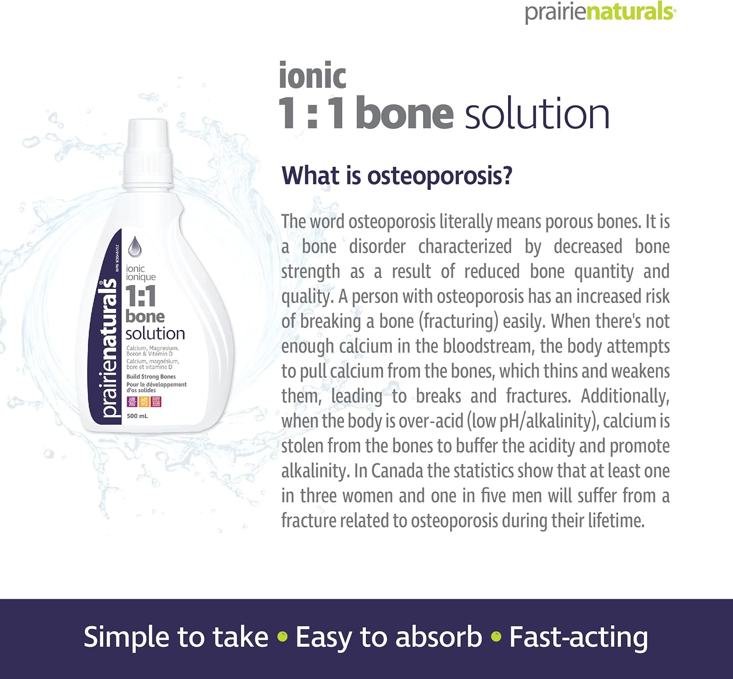 Osteoporosis? Prairie Naturals Bone Solution 1:1 is an equal ratio of liquid calcium and magnesium. It is scientifically formulated blend of calcium, magnesium and vitamin D for maximum absorption and improved utilization. These nutrients are bound to the water molecule creating a solution that is readily available to your body for maximum benefits. Bone Solution 1:1 is simple to take and easy to absorb. Bone Solution 1:1 helps prevent bone resorption and osteoporosis; regulate muscle and nerve functions; support relaxation and good sleep patterns; relieve PMS, muscle cramps and leg cramps; regulate heart beat. Mixes easily in water or your favourite juice. Sodium benzoate-free. Yeast-free.