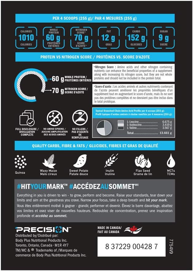 Precision BIG TIME is a clean, high calorie, high protein supplement used by athletes to support weight gain and lean muscle mass growth. BIG TIME is packed with real food ingredients like quinoa, sweet potato and inulin so that you can gain weight in a clean, healthy way. This whole protein powder free from cheap fillers and amino acid spiking, giving your body what it needs to get all 9 essential amino acids needed for muscle repair following your workouts. BIG TIME comes in 3 great tasting flavours that are also low sugar so that you can grow and recover without causing an insulin spike.