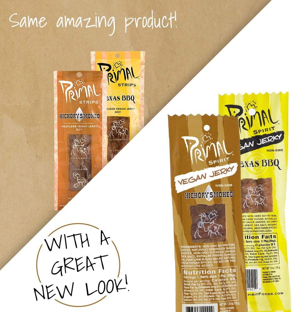 Primal Spirit Vegan Jerky - Soy Protein Energy Pack, 10 g. Plant Based Protein, Certified Non-GMO, No Preservatives, Sports Friendly Packaging The Classics Hickory Smoked and Texas BBQ (12-Pack, 1 oz)