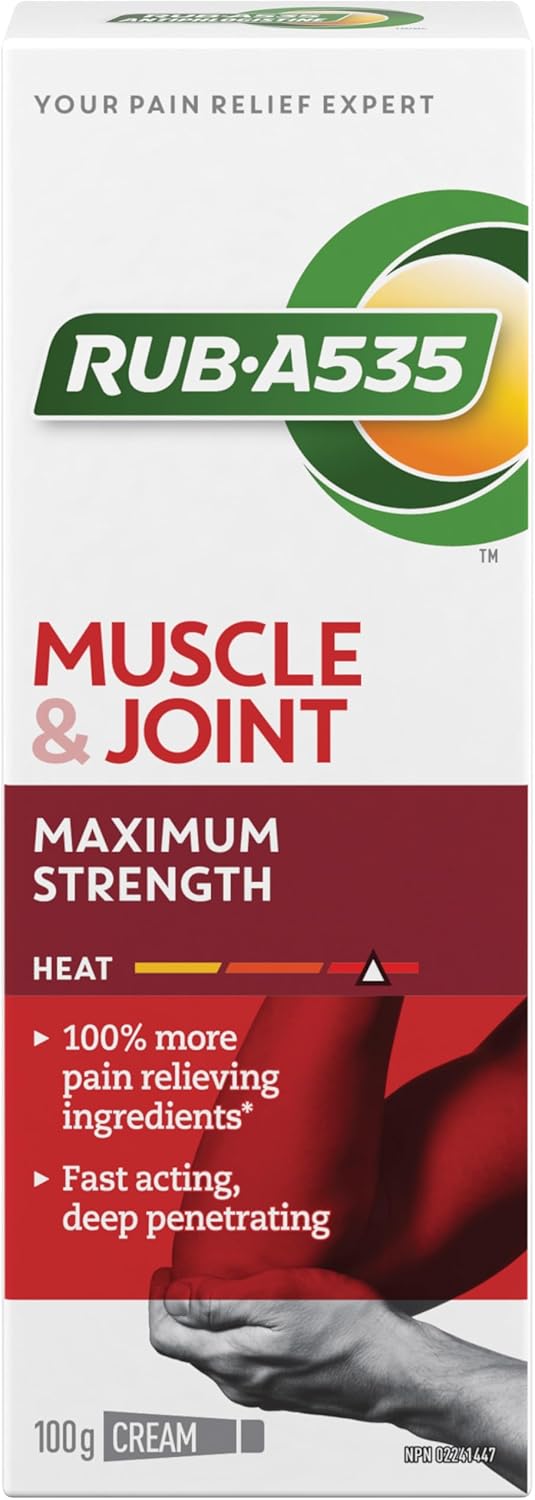 Experience fast-acting and maximum strength pain relief with Rub-A535 Muscle & Joint Maximum Strength Cream. This powerful cream provides deep penetrating heat and soothing temporary relief from sore, aching muscles, and stiff joints. With 100% more pain-relieving ingredients, such as Methyl Salicylate and Eucalyptus, compared to our regular strength formula, Rub A535 Muscle & Joint Maximum Strength Cream delivers enhanced relief. The non-greasy and non-staining formula makes it a practical treatment solution for use at home, work, while out and about, or during travel. Simply apply a thin and even layer to the affected area and gently massage for relief exactly where you need it. Proudly manufactured in Quebec, Canada for over 90 years, Rub A535 is dedicated to helping Canadians effectively manage their pain.
