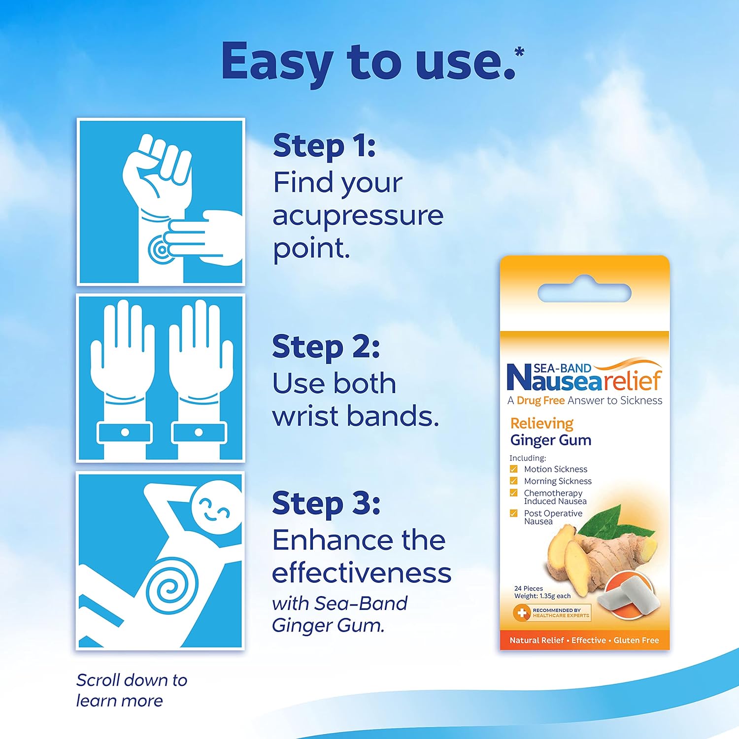 Assorted colors Sea-Band for travel sickness planes, trains, boats, cars, coaches and even at the funfair. Try them - they really work. Travelling the world - for business or pleasure - is now easier than ever. But whether your journey is by air, road, rail or sea it can be a miserable experience if you suffer from travel sickness. The nausea, dizziness and vomiting caused by any form of transport are triggered by a confusion of messages received in the brain. Although you may be sitting motionless in a seat, your senses tell you that you are actually moving. Contrary to common belief, the resulting nausea is not "all in the mind" and is experienced by children and adults alike. Early signs of travel sickness include quietness, headaches and lethargy, often followed by uncontrollable vomiting. Drug-free remedies anti-sickness drugs may have unwanted side-effects such as drowsiness and may not be suitable for children or for some adults. Yet there are other ways to help prevent nausea: In cars or buses, sit at the front and always face the direction in which you are travelling. Don't look out of side windows and focus on the horizon. Breathe in fresh air - open a window or stay outside on a ship's deck. Don't eat a heavy or greasy meal before travelling. Keep children occupied - play an "I spy" game for example. Most importantly, wear Sea-Bands during your journey.