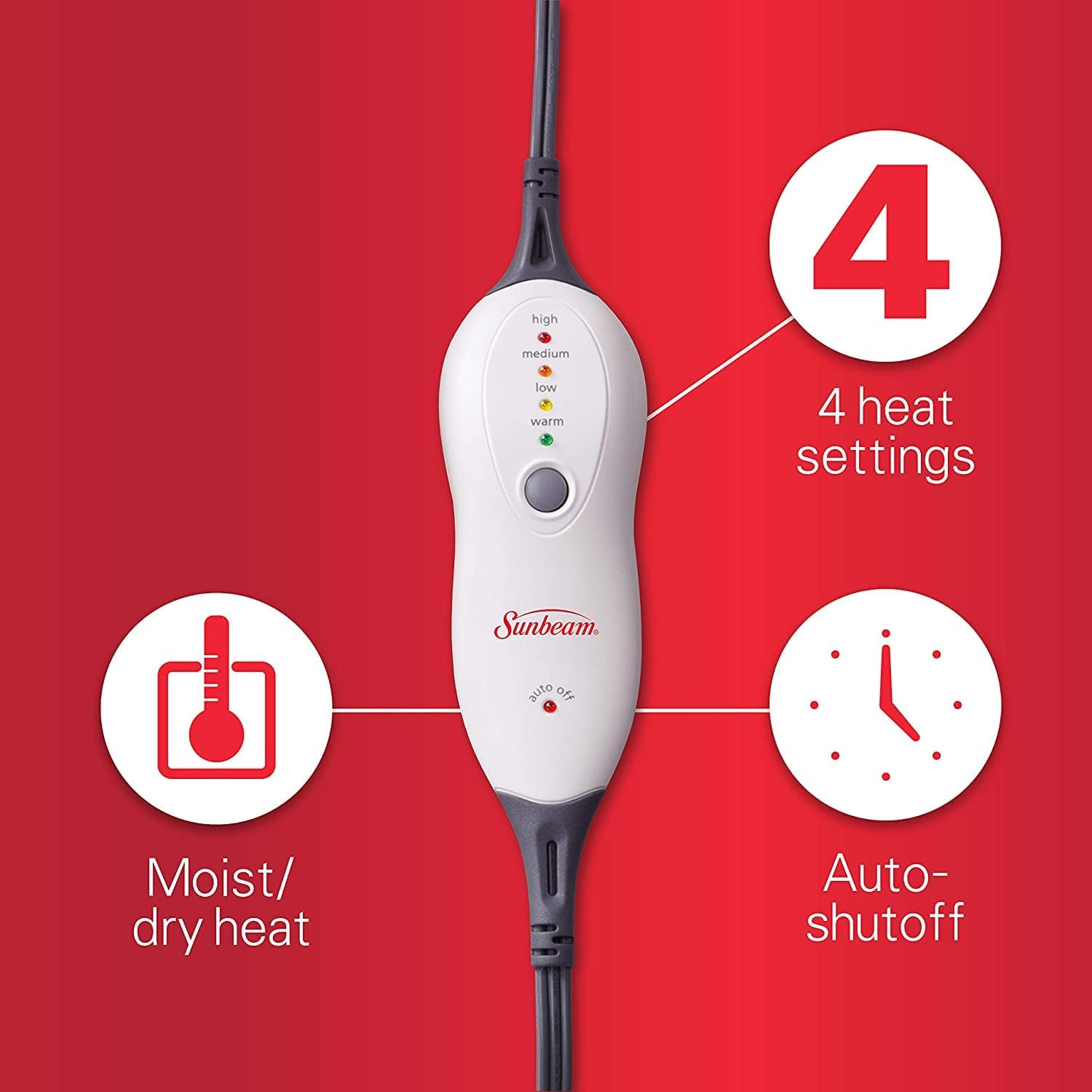 Sunbeam's Renue Heat Wrap delivers soothing heat therapy for common muscle pain in the neck and shoulders. The soft, plush wrap stays in place with lightly-weighted edges and a magnetic closure for hands-free use to help accelerate tissue healing and relax sore muscles associated with muscle tension and stress. Customize treatment with 4 different heat settings and 2 hour auto-off for peace of mind. Enjoy convenient features such as an easy-to-use push button controller with LED heat settings lights for visibility in the dark and a long 9-foot cord for added convenience. For optional moist heat therapy, spray fabric with water for deep, penetrating pain relief. The entire flexible, plush wrap is fully machine-washable for easy care, just disconnect the controller.