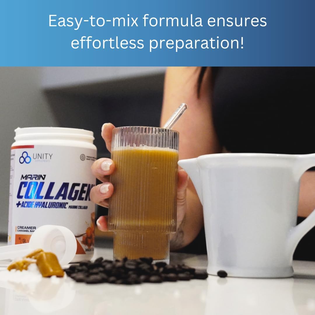 Unity Supplements Marine Collagen Powder with Hyaluronic Acid - Salted Caramel Flavored Coffee Sweetener - 360g, 30 Servings - 10g Marine Collagen per Serving - Promotes Skin, Nail, Hair & Joint Health