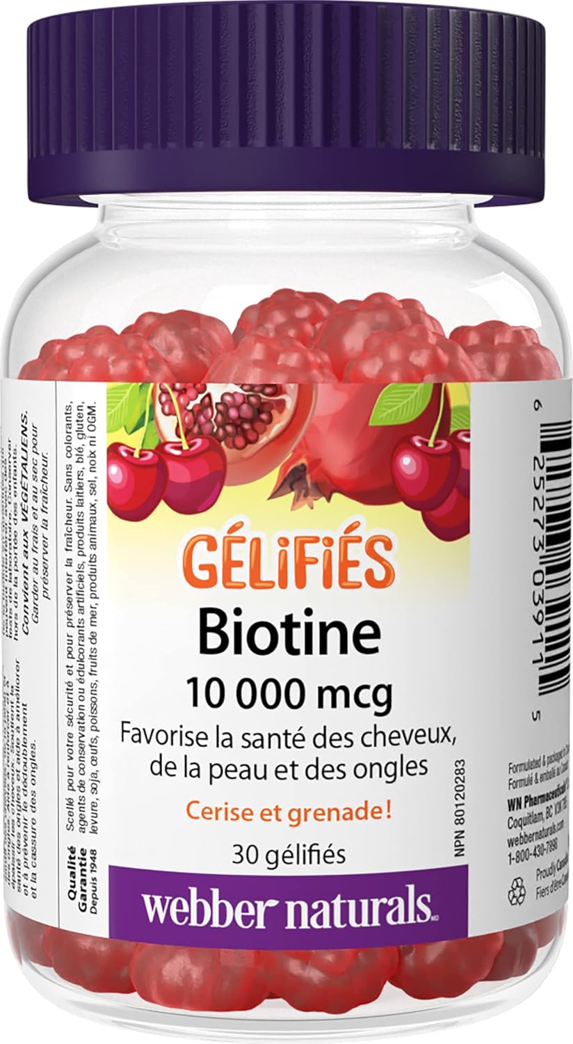 Webber Naturals Apple Cider Vinegar Gummy, 200 mg with The Mother, 90 Gummies, Antioxidants Support, VeganApple Cider Vinegar gummies from Webber Naturals offer an easy and convenient way to reap the benefits of this traditional remedy. Apple cider vinegar (ACV) gummies are a source of antioxidants to fight off damaging free radicals. ACV is traditionally used to support digestion, detoxification, and energy. Provided naturally with the "mother" (the combination of yeast and bacteria formed during fermentation), these delicious apple-flavoured gummies are non-GMO and suitable for vegans and vegetarians.Webber Naturals Biotin 10,000 mcg, 30 Gummies, Supports Healthy Hair, Skin & Nails, Energy Metabolism, VeganBiotin 10,000 mcg Gummies from Webber Naturals is a non-GMO, one-per-day formula that can help prevent biotin deficiency and promote healthy, beautiful hair, skin, and nails. Biotin is an essential B vitamin also needed for the metabolism of nutrients to support optimal energy levels. Biotin 10,000 mcg Gummies from Webber Naturals offers delicious, fruit-flavoured, high-potency gummies for beautiful hair, skin, and nails, along with energy support.