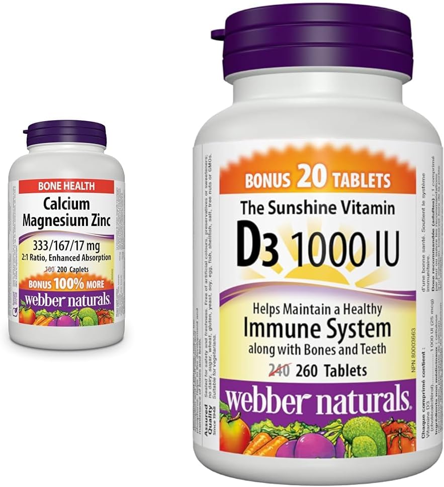 Webber Naturals Calcium with Magnesium and Zinc, 200 Caplets, Enhanced Absorption, Helps Support Bones and Teeth, VeganCalcium Magnesium with Zinc from Webber Naturals is an easily absorbable supplement that not only helps in the development and maintenance of healthy bones and teeth, but also helps the body metabolize carbohydrates, proteins, and fats. The minerals allow for excellent absorption for those with low stomach acid levels.Webber Naturals Vitamin D3 1000 IU, 260 Tablets, For Healthy Bones, Teeth, and the Maintenance of Good HealthVitamin D, also known as the "sunshine vitamin", is a critical nutrient for the development and maintenance of healthy bones and teeth. Vitamin D3 1000 IU from Webber Naturals contains the preferred cholecalciferol form of vitamin D. It helps the body absorb calcium and phosphorus, and is a factor in the maintenance of good health.
