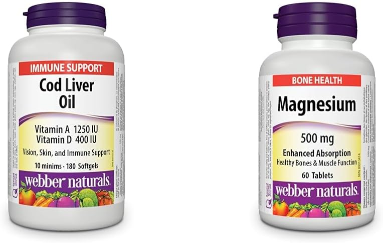 Webber Naturals Cod Liver Oil with Vitamin A and D3, 180 Softgels, Vision, Skin, and Immune SupportCod Liver Oil from Webber Naturals is a natural source of the fat-soluble vitamins A and D. Vitamin A helps maintain eyesight, night vision, skin, membranes, and immune function, while vitamin D helps in the development and maintenance of bones and teeth.Webber Naturals Magnesium 500 mg, 60 Tablets, Enhanced Absorption Mineral, Supports Bone and Muscle Functions, VeganMagnesium Enhanced Absorption from Webber Naturals is our highest potency magnesium supplement, providing 500 mg of elemental magnesium per tablet. Magnesium helps in the development and maintenance of bones and teeth. It also helps in tissue formation and in maintaining proper muscle function.