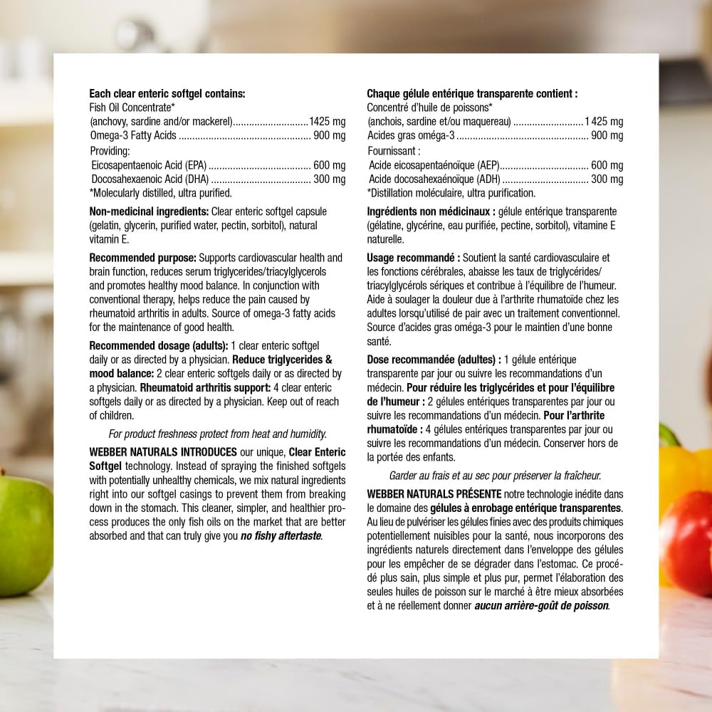 Webber Naturals Omega-3 900 mg Triple Strength, 120 Clear Enteric No Fishy Aftertaste Softgels, Supports Cardiovascular Health and Brain Function