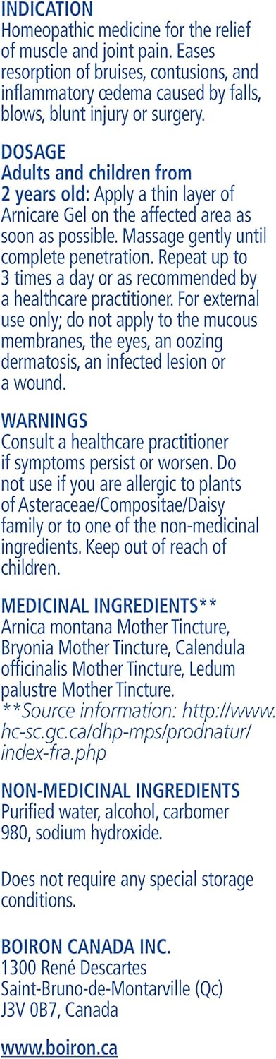 关于 Boiron Boiron 公司由双胞胎兄弟兼药剂师 Jean 和 Henri Boiron 于 1932 年在法国里昂创立。作为顺势疗法药物领域的全球领导者,Boiron 是一家市值 9.5 亿美元的上市公司,拥有 3,600 名员工,产品销往 50 多个国家。公司以其畅销的流感顺势疗法药物 Oscillococcinum、Arnicare 系列顺势疗法止痛药以及儿童顺势疗法药物而闻名。80 多年来,Boiron 一直致力于资助科学研究,并向公众和医疗保健专业人士普及顺势疗法药物知识。作为一家制药公司,Boiron 始终秉持最高生产标准,严格遵守加拿大卫生部法规、顺势疗法药典和良好生产规范 (GMP)。公司与代理商、分销商和零售连锁店合作,致力于为广大消费者和医生提供顺势疗法药物。Boiron 加拿大的员工超过50名员工,包括药剂师、实验室技术人员、会计和IT人员、市场营销和公共关系人员、全国销售团队、客户服务以及订单履行和运输专业人员——其中许多人在公司拥有令人印象深刻的长期职业生涯。我们的使命是通过推广顺势疗法来促进医疗保健的变革。在Boiron,我们相信不止一种方法可以让人感觉更好。自1932年以来,Boiron家族一直致力于提供优质药品。作为顺势疗法的全球领导者,您的健康是我们的热忱所在。您的满意是我们的承诺。观看我们的视频,了解更多关于Boiron加拿大的信息。更多关于Arnicare的信息 Arnicare凝胶可缓解肌肉和关节疼痛,并减轻因跌倒、打击、钝性损伤或手术引起的瘀伤和炎性水肿的吸收。Arnicare凝胶是一种快速吸收的凝胶,由100%天然来源的药用成分制成,包括山金车。它不含对羟基苯甲酸酯、香料、薄荷醇和非甾体类化合物。抗炎药(非甾体抗炎药)。山金车凝胶可与口服山金车片剂联合使用,用于全身和局部缓解。山金车凝胶推荐用于成人和3岁以上儿童。山金车凝胶由多种植物制成,包括山金车(又名山菊)。其治疗功效已被人们使用了数百年。