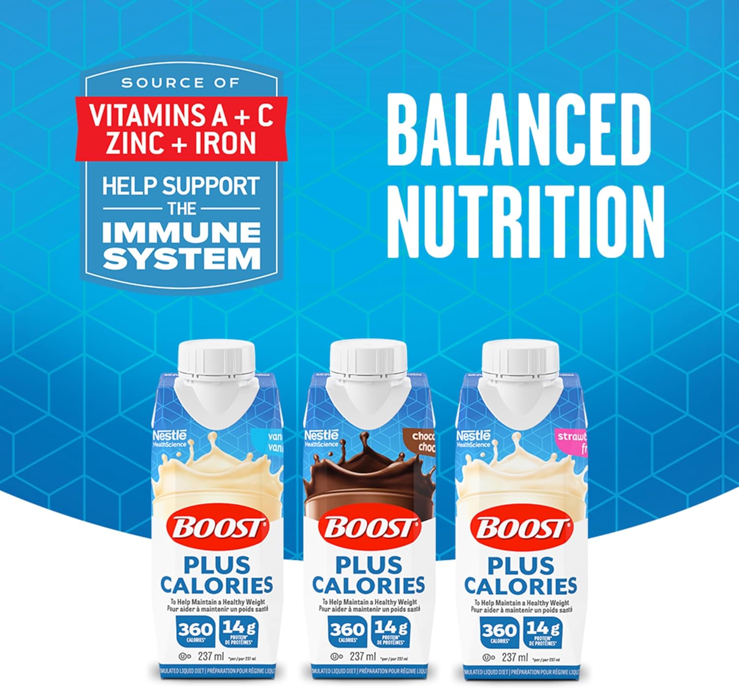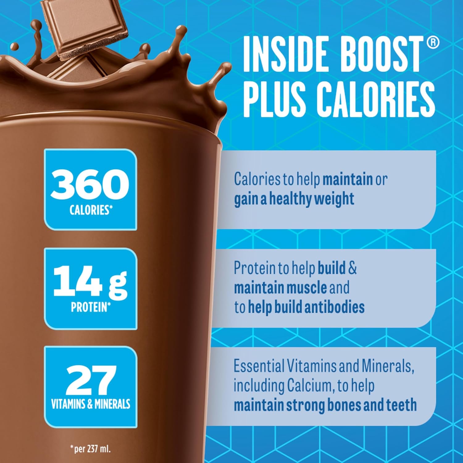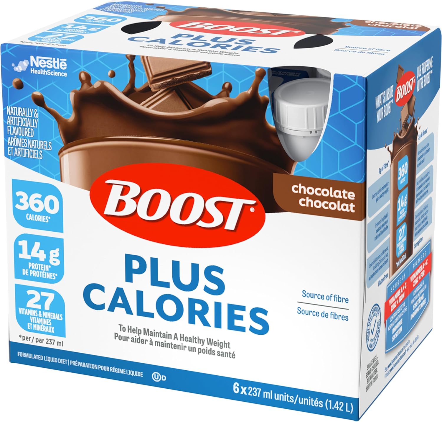 BOOST PLUS 全营养饮品 - 巧克力味(6 x 237 毫升)是一款配方流质膳食,提供全面营养,专为寻求保持或增重健康体重的人士设计。每份 237 毫升含有 360 卡路里、27 种维生素和矿物质以及 14 克蛋白质。此外,我们的配方保证您一定会爱上它带来的美味*。其他口味包括草莓和香草。仅供口服。请遵医嘱服用。*附带条款和条件。