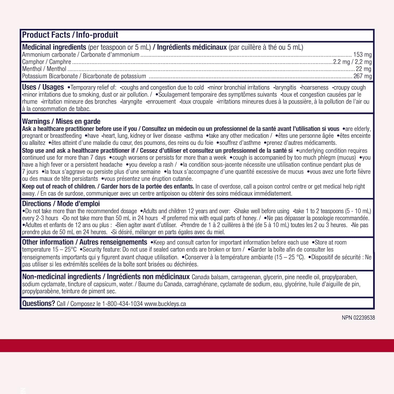 Buckley's Original Mixture Syrup 糖浆可快速有效缓解感冒引起的咳嗽和鼻塞,以及轻微的支气管刺激、喉炎、声音嘶哑和哮吼性咳嗽。Buckley's Original Mixture Syrup 糖浆不引起困倦。每茶匙(5 毫升)含 153 毫克碳酸铵、267 毫克碳酸氢钾、22 毫克