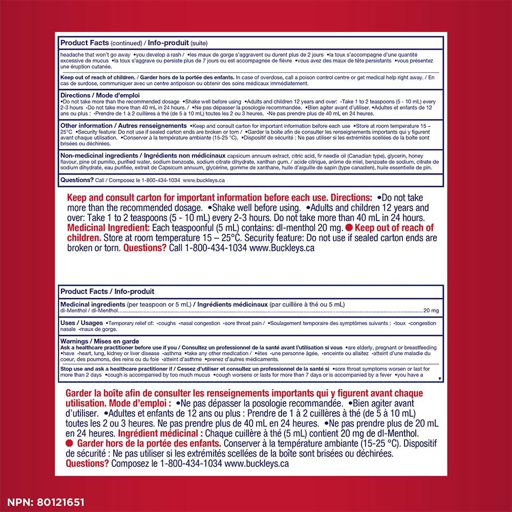 BUCKLEY'S 舒缓混合糖浆,用于缓解咳嗽、鼻塞和咽喉痛,250毫升
