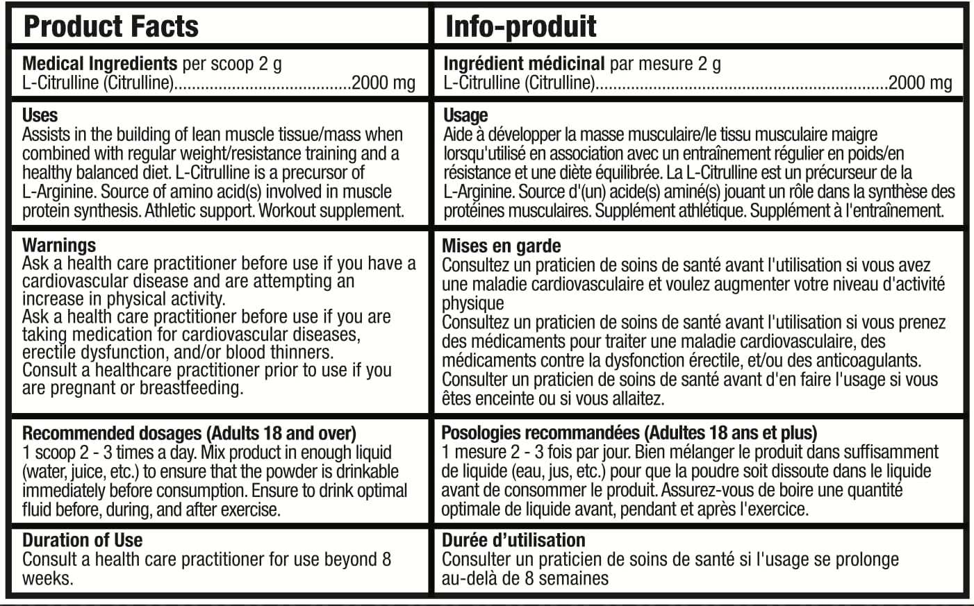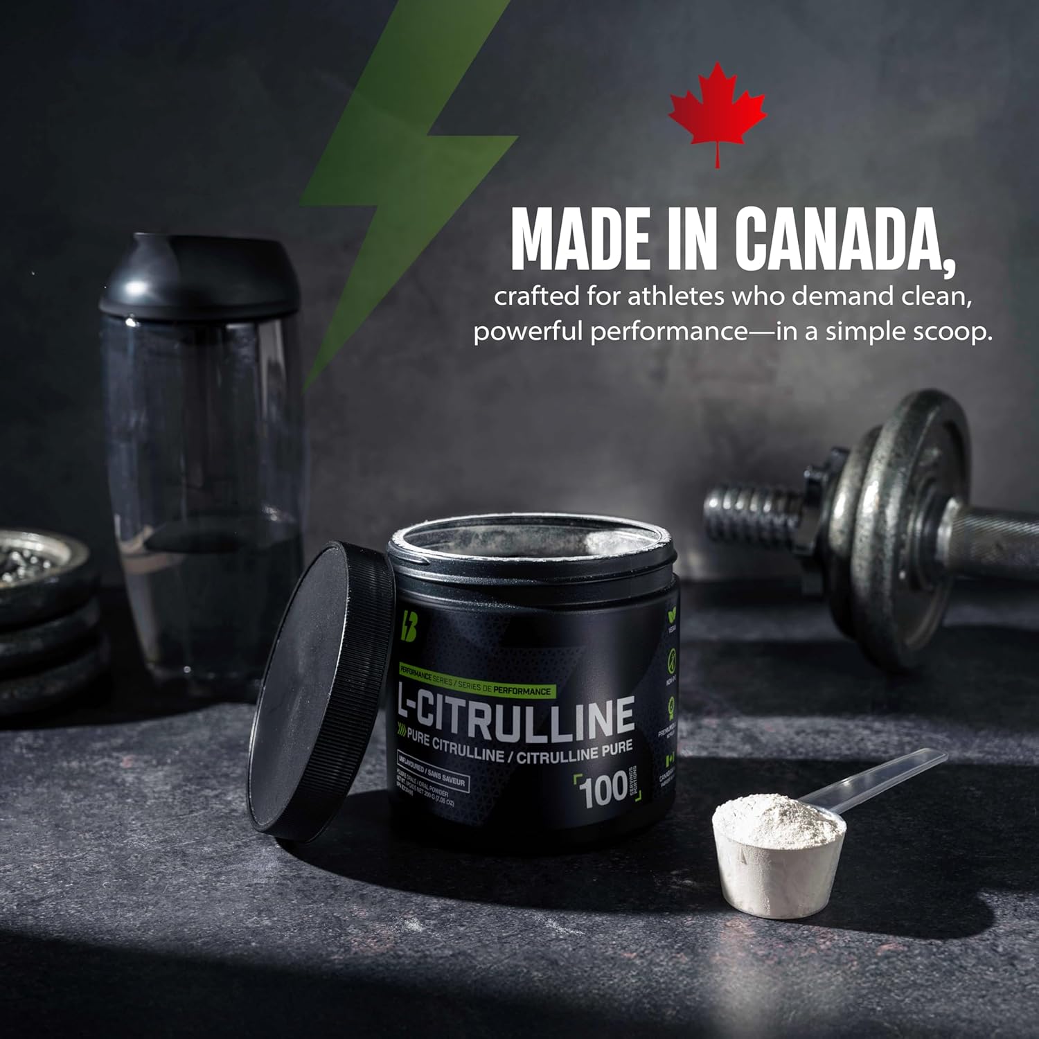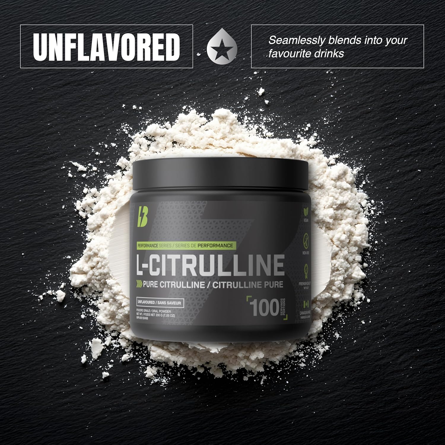 BULL Nutrition – L-瓜氨酸粉,一氧化氮促进剂和泵配方,可增强血液循环、能量和肌肉恢复 – 加拿大制造 – 100份,200克,无味