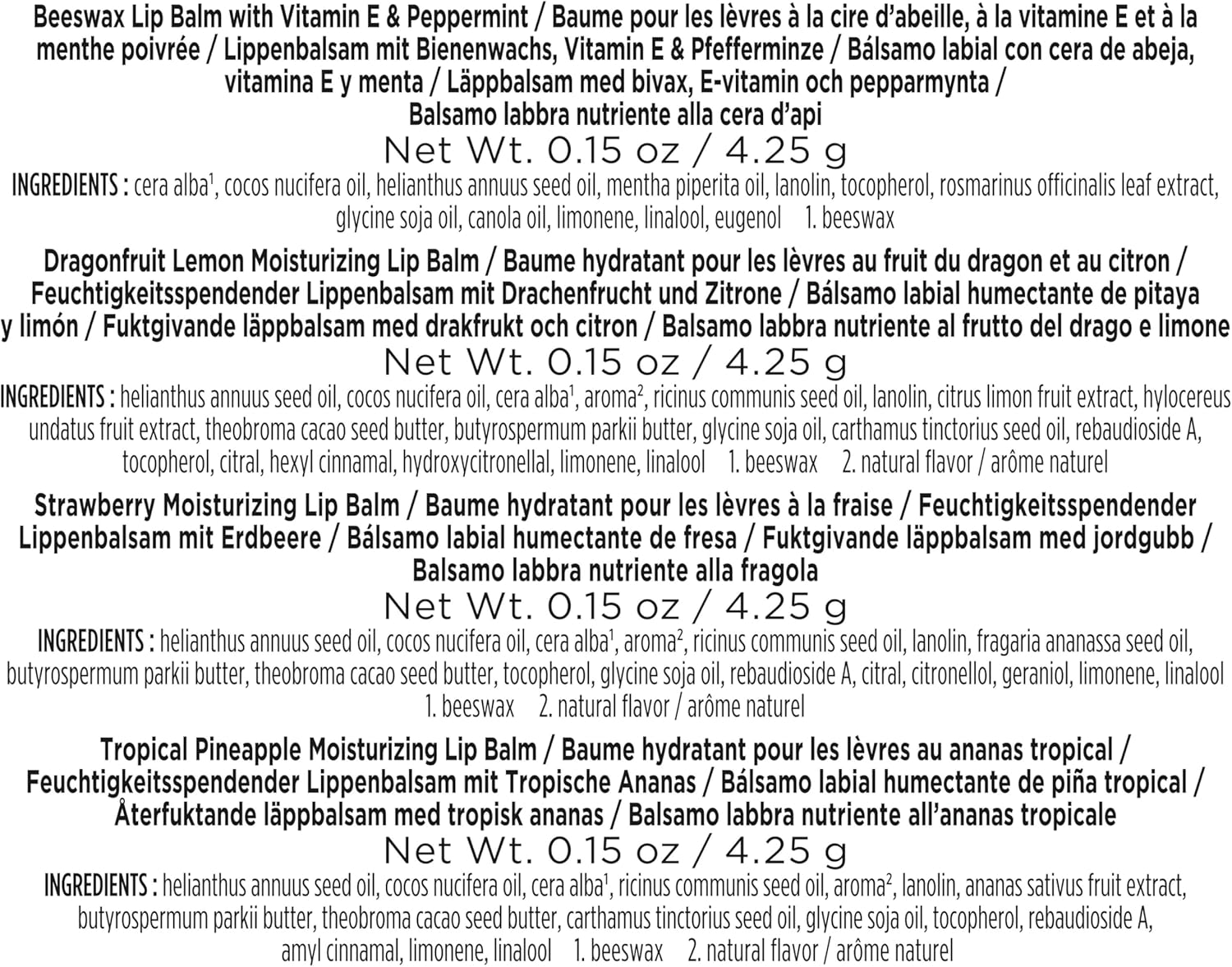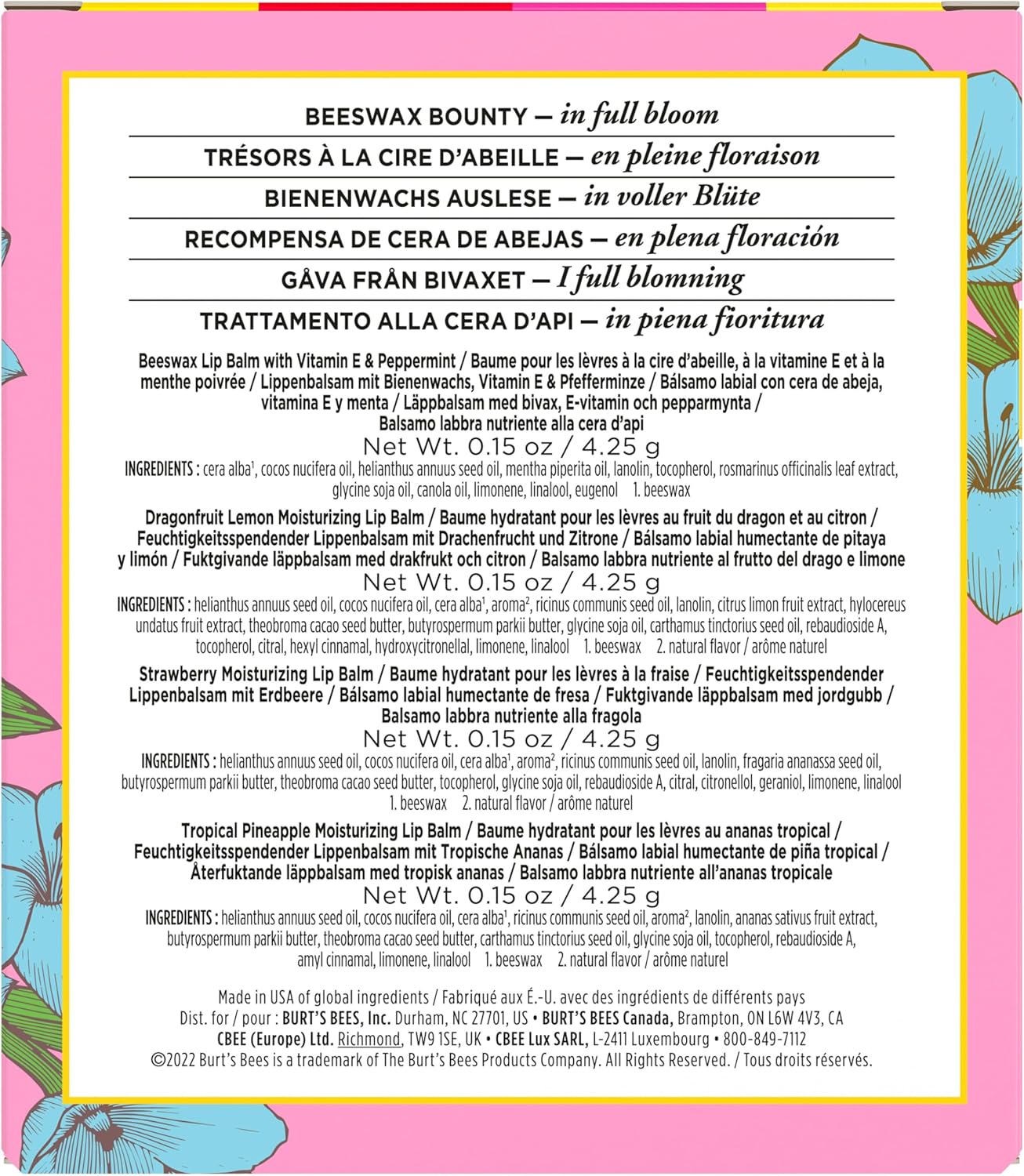Burt’s Bees 盛开润唇膏套装 - 男女通用,4 件装(原味蜂蜡、火龙果柠檬、热带菠萝、草莓)每件 0.15 盎司