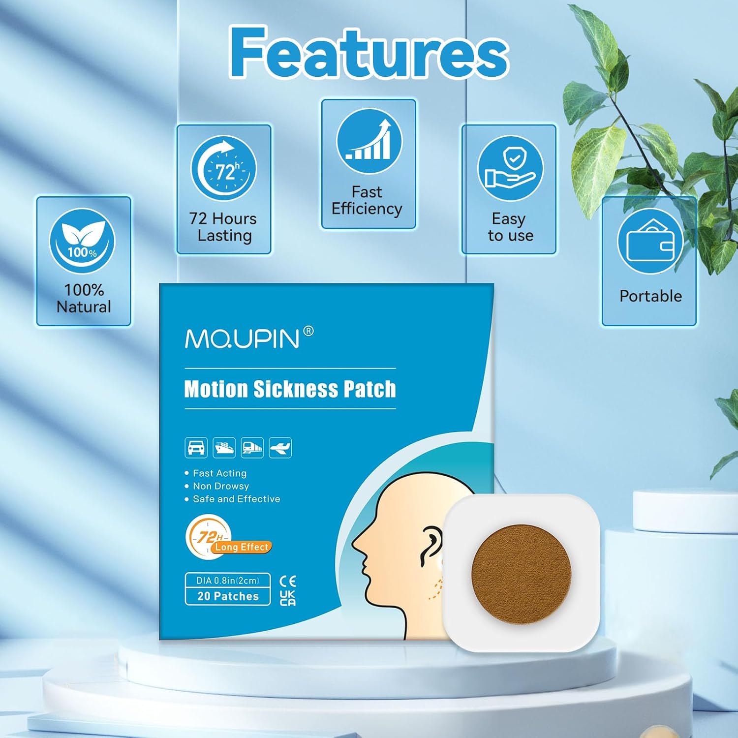 【旅行必备】MQUPIN晕车贴能有效减轻乘汽车、轮船、飞机、火车等旅行引起的头晕。【安全天然草本】采用100%天然草本制成。晕车贴是极好的晕车缓解用品,对晕车、晕船症状有很好的效果。【使用方便】撕掉晕船贴上的白色塑料背衬,将粘性面贴在肚脐或耳垂后面干燥无毛的皮肤上,每只耳朵后面贴一张晕车贴。【起效快,持久】出行前10分钟贴在身上,晕车严重时,可以同时贴在肚脐和耳后,效果可持续1-3天。【携带方便】我们的邮轮晕船贴小巧轻便,可放入口袋、包或手提箱,非常适合随身携带
