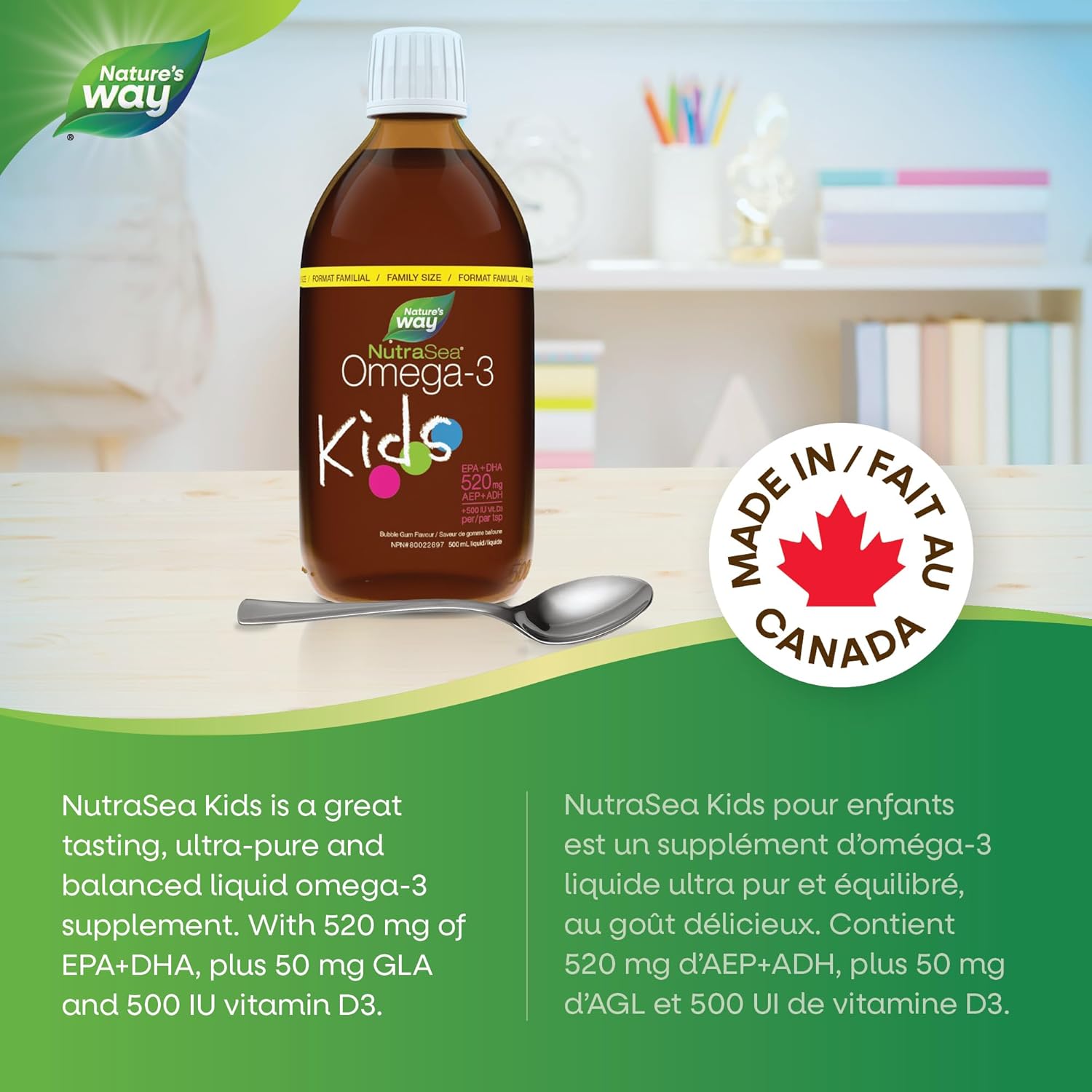 Nature’s Way NutraSea Omega-3 Kids 是一款口感极佳的儿童鱼油液体,富含 EPA、DHA、GLA 和维生素 D,有助于促进大脑、认知、骨骼、牙齿和免疫系统发育。支持 12 岁以下儿童的大脑、眼睛和神经发育。每 5 毫升含 2.02 克鱼油、0.56 克月见草油、320 毫克 EPA、200 毫克 DHA、50 毫克 GLA 和 500 IU 维生素 D3。产品经海洋之友认证,并通过 PureCheck 纯度和可持续性验证。服用方法:1 至 14 岁儿童:每日服用 1 茶匙。采用高油酸葵花籽油、天然香料、生育酚(大豆)、绿茶提取物和罗汉果提取物制成。50 多年来,Nature’s Way 一直致力于确保每款鱼油补充剂的质量、纯度和安全性。