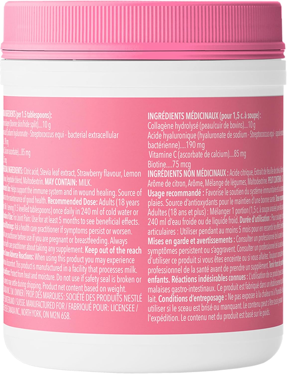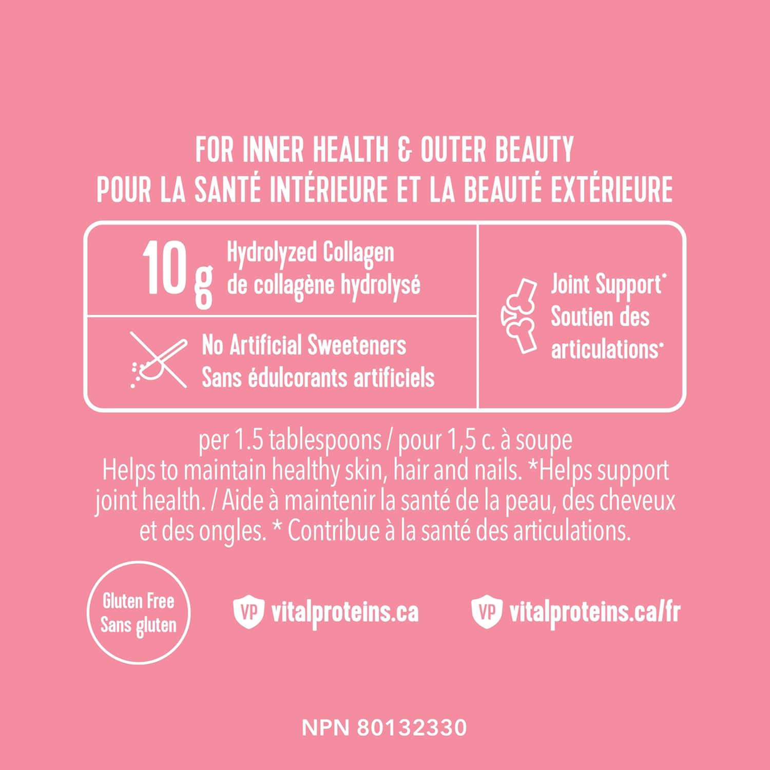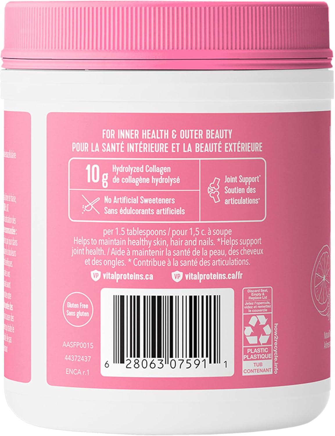 使用 Vital Proteins 草莓柠檬美容胶原蛋白粉升级您的美容和健康程序。这款美容饮品美味可口,不含人工甜味剂,口味淡雅,含有水解胶原蛋白、透明质酸、生物素和维生素 C,有助于维持健康的皮肤、头发和指甲。它还能帮助我们的身体形成胶原蛋白,从而支持结缔组织、肌腱、韧带和骨骼的结构和弹性。VITAL PROTEINS 还能提供关节支持,有助于减轻骨关节炎引起的关节疼痛。VITAL PROTEINS 美容胶原蛋白粉不含麸质,不添加糖和人工香料。只需将 1.5 汤匙 VITAL PROTEINS 美容粉溶于水、冰沙、咖啡或食物中即可。现在采用全新、更环保的包装,塑料含量更少。VITAL PROTEINS。我们是胶原蛋白。