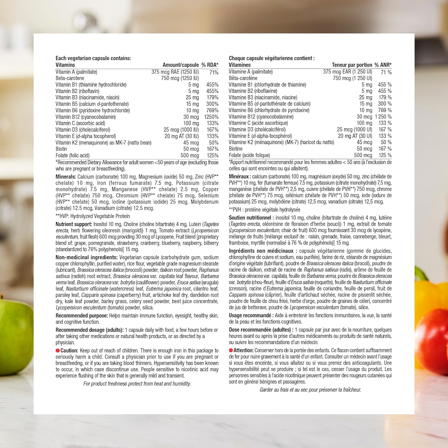 女性最全面的复合维生素提供100%的推荐维生素和矿物质,有助于增强女性的能量、免疫功能、骨骼健康等。每粒每日一粒的易吞服胶囊,以非转基因全食物为基质,富含生物可利用的必需营养素,包括维生素K2和螯合矿物质,适合素食者。