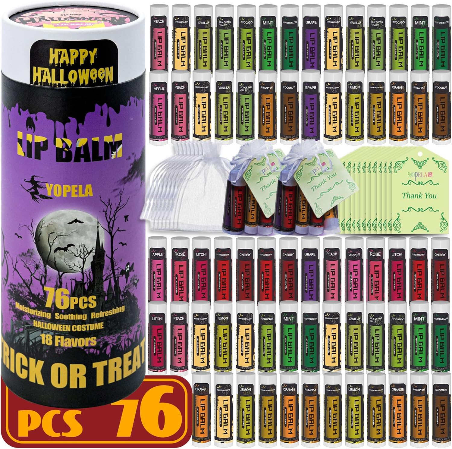 Yopela 76 支装万圣节润唇膏,含维生素 E 和椰子油,唇部护理产品 - 保湿、舒缓和修复干燥和皲裂的嘴唇,19 种口味和派对礼品卡