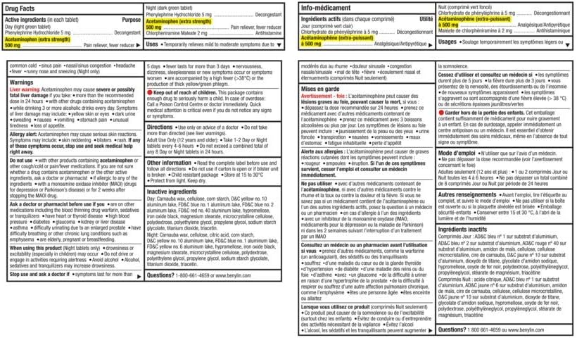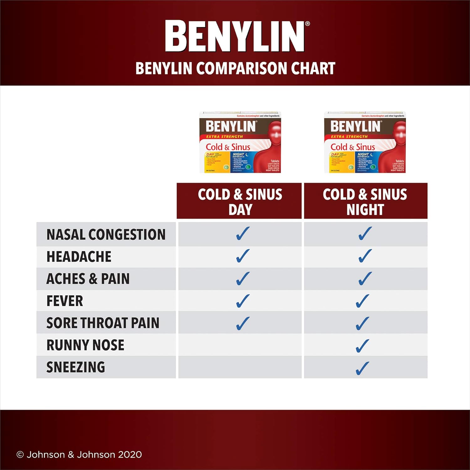 Benylin 强效感冒和鼻窦炎日/夜片,20 片,是一种便携式便捷解决方案,可在白天和夜间缓解您的感冒和鼻窦症状。快速有效地缓解鼻窦疼痛、鼻塞、头痛和发烧。每包 20 片,其中 10 片为日用片,10 片为夜用片。日用片和夜用片均含有 5 毫克减充血剂盐酸苯肾上腺素(可缓解鼻塞)和 500 毫克镇痛剂对乙酰氨基酚(可缓解鼻窦疼痛、头痛和发烧)。夜用片还含有 2 毫克抗组胺药马来酸氯苯那敏(可缓解流鼻涕和打喷嚏)。使用方法:成人和 12 岁及以上儿童,每 4 小时服用 1-2 片日用片或夜用片。24 小时内日用片或夜用片的总量不得超过 8 片。服用 Benylin 时,请务必牢牢记住这一点。