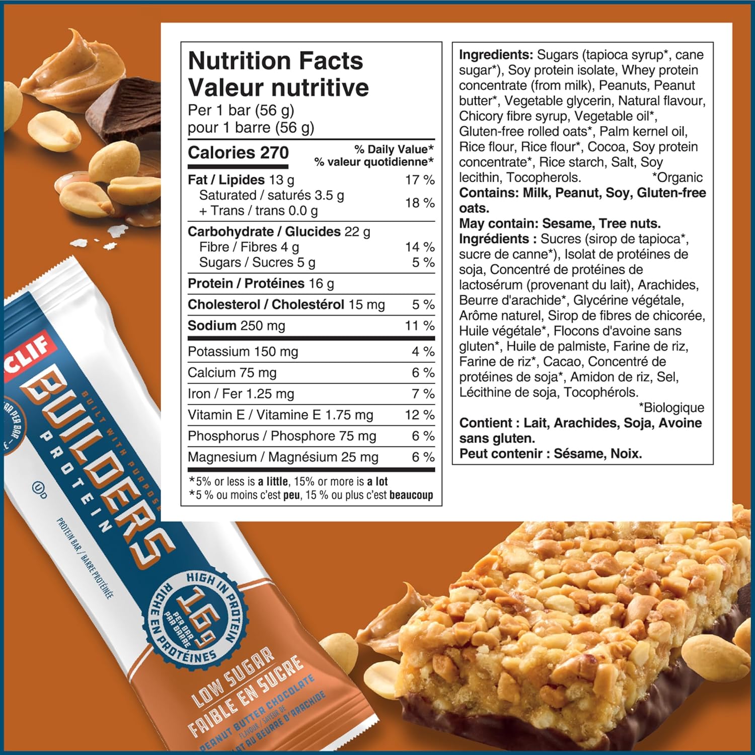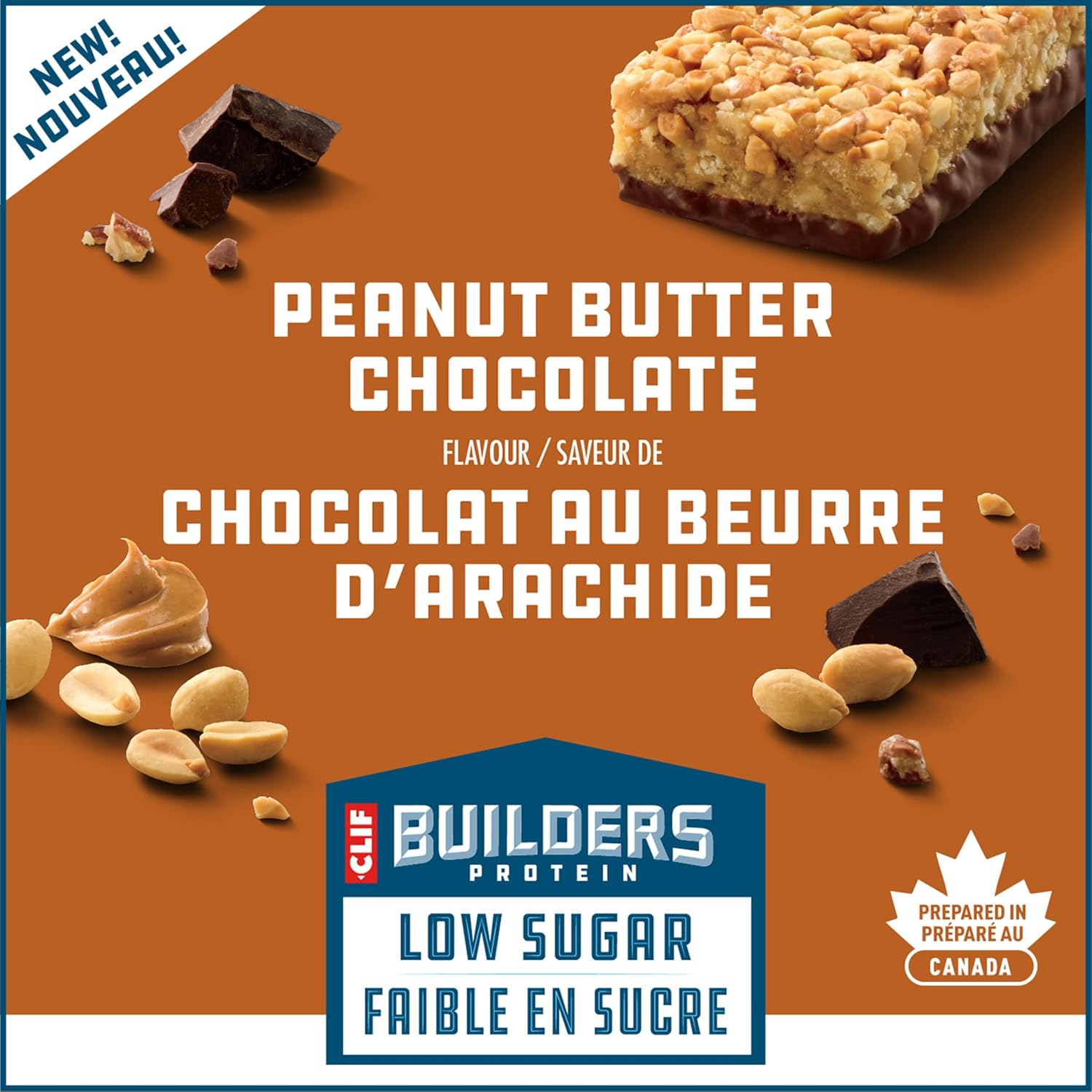 CLIF BUILDERS 低糖蛋白棒,12 包,每包 56 克,16 克蛋白质,5 克糖,不含人工甜味剂,花生酱巧克力味,高蛋白零食,加拿大制造