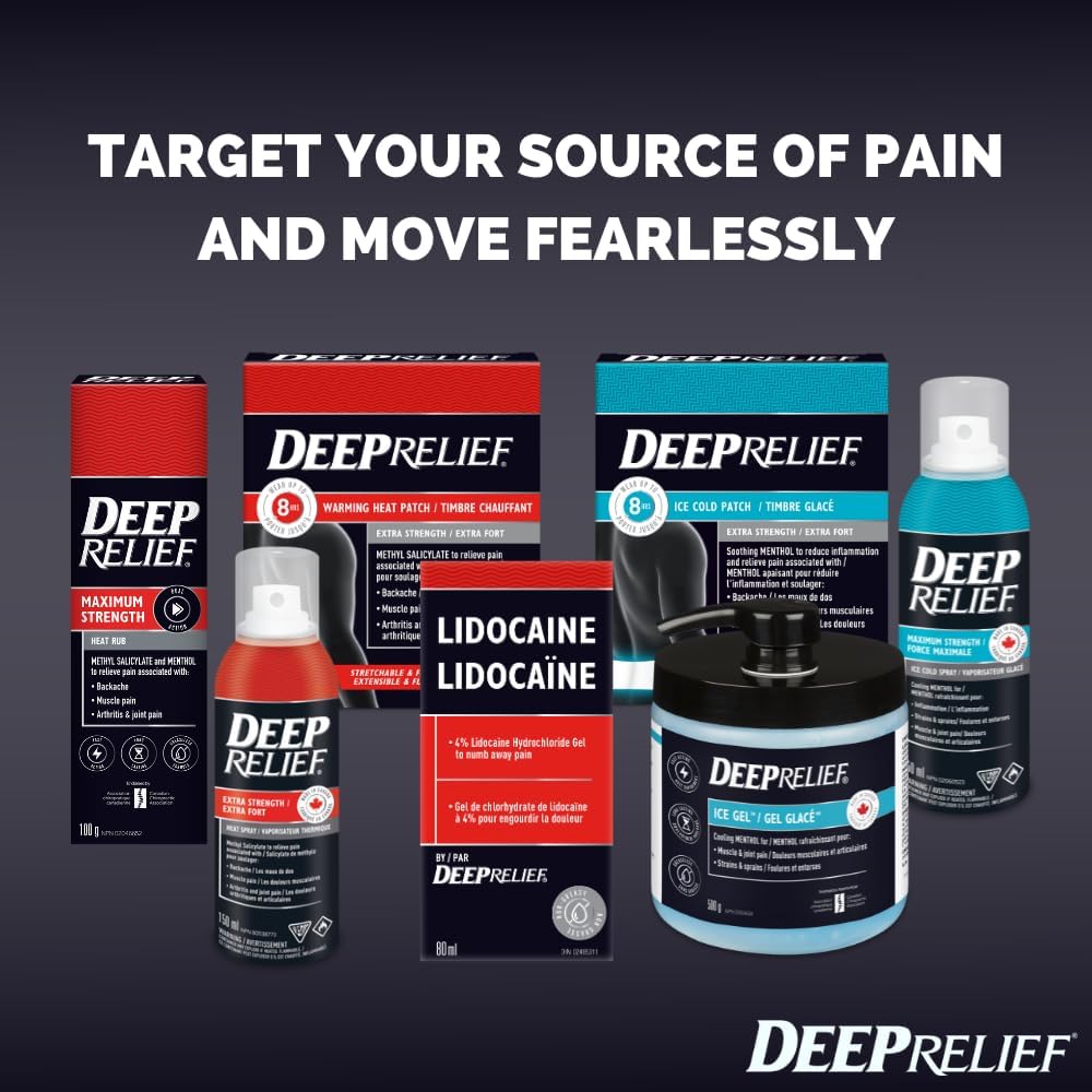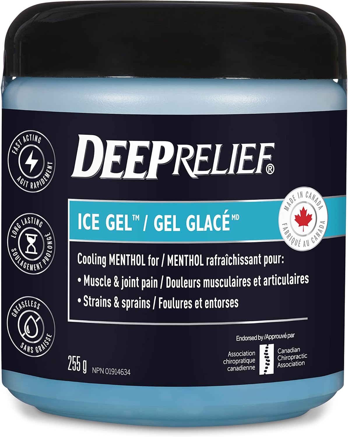 冰冻凝胶 (Ice Gel) 可消炎,有效持久地缓解急性损伤、肌肉酸痛等疼痛。提供 100 毫升管装、255 克罐装和 500 克经济型罐装三种规格,并配有便捷的锁定泵。Deep Relief 是一系列快速起效、持久渗透的止痛产品,旨在直击您的疼痛根源。Deep Relief 产品 50 多年来一直深受加拿大人的信赖,并且是唯一获得加拿大脊椎按摩协会 (Canadian Chiropractic Association) 认可的止痛产品。