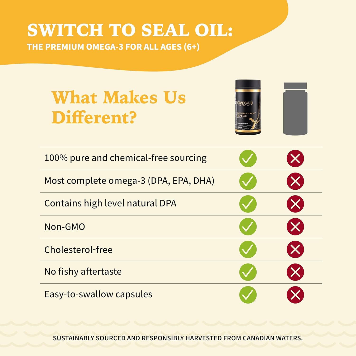 Nova Sea 大西洋海豹油软胶囊是一款优质的 Omega-3 补充剂,源自北大西洋清澈冰冷的海水。与传统鱼油不同,海豹油不仅富含 EPA 和 DHA,还富含 DPA(二十二碳五烯酸),这是一种稀有且高效的 Omega-3,具有独特的健康益处。DPA 可增强 EPA 和 DHA 的功效,作为 Omega-3 链中的关键中介,提供增强的抗炎和心血管保护作用。由于海豹油的分子结构更接近人体脂肪细胞,因此您的身体可以比鱼油更有效地吸收和利用它,从而使每粒软胶囊的功效更显著。每粒软胶囊都含有均衡的 Omega-3 脂肪酸,可支持大脑健康、眼部健康、心脏功能、关节灵活性和免疫力等重要功能。Nova Sea 海豹油采用可持续方式从健康的海豹种群中采集,并经过严格的质量控制,以确保其纯度、效力和可追溯性。