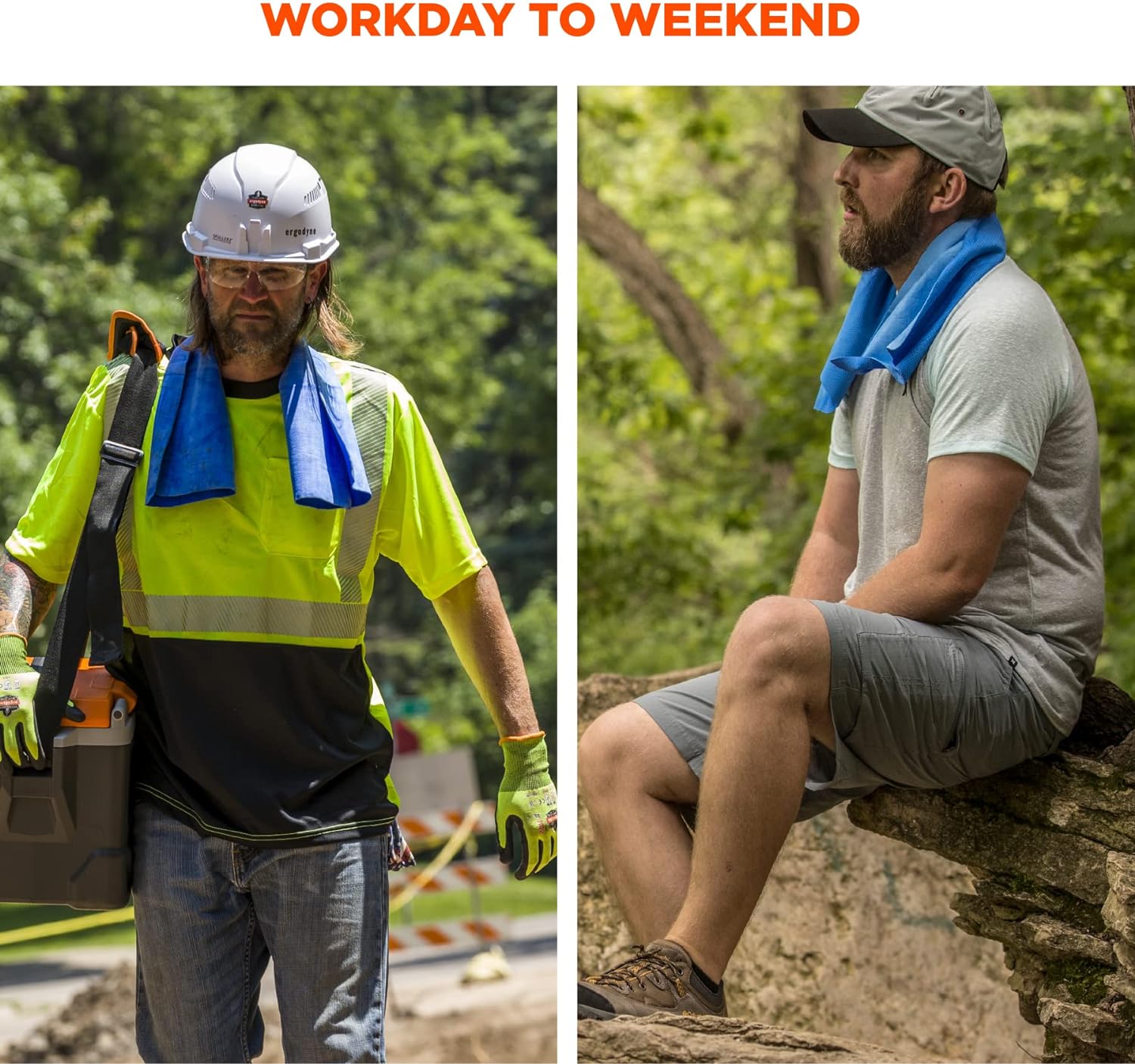Ergodyne Chill-Its 6602 蒸发式冷却毛巾采用超强蒸发性 PVA 材料,可吸收水分,然后缓慢蒸发,带来即时持久的清凉感受。这种超强蒸发性 PVA 材料旨在营造比环境气温更低的冷感,并且比市面上其他冷却毛巾吸收和锁住更多水分,带来更持久的清凉。这款颈部冷却巾可使用数小时或快速缓解疼痛,可重复使用,只需重新润湿即可激活。激活方法:将 PVA 冷却毛巾在水下浸泡一分钟或直至浸透,拧干多余的水分,在空中旋转或弹开,即可获得无滴落的清凉效果。将毛巾围在颈部或头部,即可立即获得清凉感受。毛巾干燥后会变硬,只需重新润湿至柔软即可激活,然后即可再次使用。毛巾可重复使用。存放前,请检查产品是否有污垢和碎屑。如有脏污,请机洗,然后存放在塑料管容器中以安全保存。这款蒸发毛巾是任何在高温下工作或可能患上热痉挛、中暑或热衰竭等热相关疾病的人的理想降温头饰。它非常适合建筑、木工、采矿、园林绿化行业的工人,也适合户外活动,例如露营、瑜伽、棒球、垒球、足球、跑步、骑行、海滩或船上度假、高尔夫、庭院工作、钓鱼、园艺、徒步旅行、骑摩托车等等。
