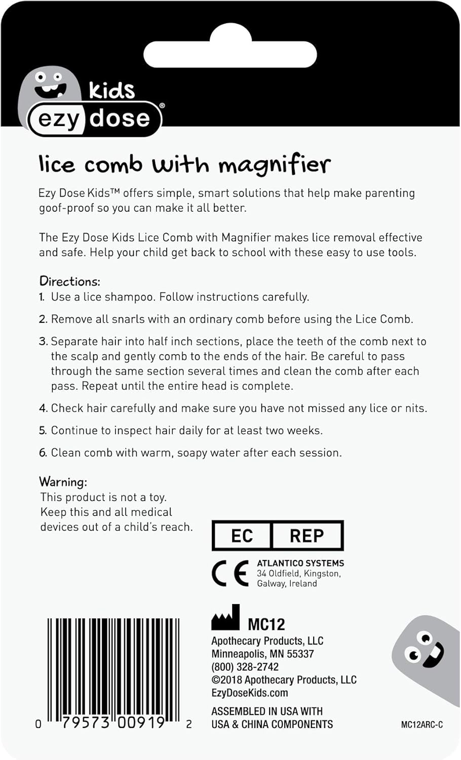 Ezy Dose Kids 虱子和虱卵梳子,婴儿、幼儿、成人护发,不锈钢针齿
