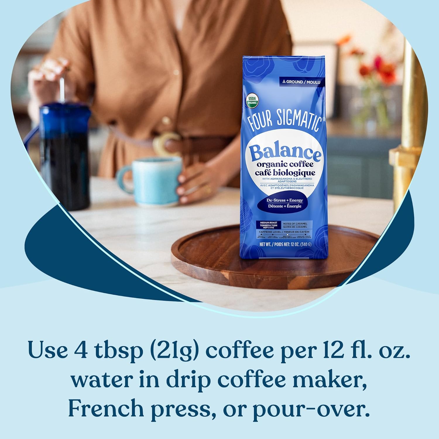 Four Sigmatic 有机平衡适应原研磨咖啡 | 中度烘焙 USDA 有机咖啡,含南非醉茄、白桦茸、刺五加和圣罗勒 | 提升专注力和能量的咖啡 | 12 盎司/袋