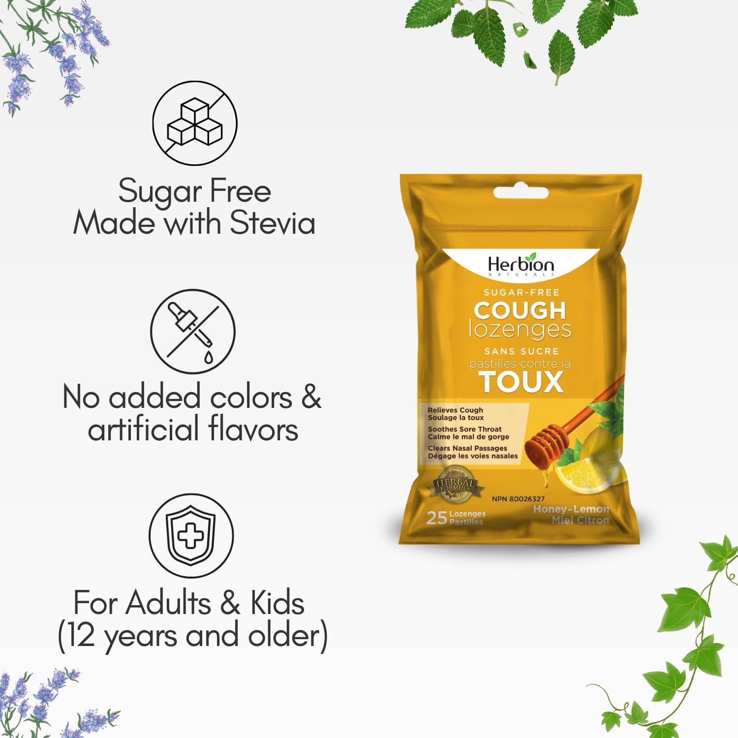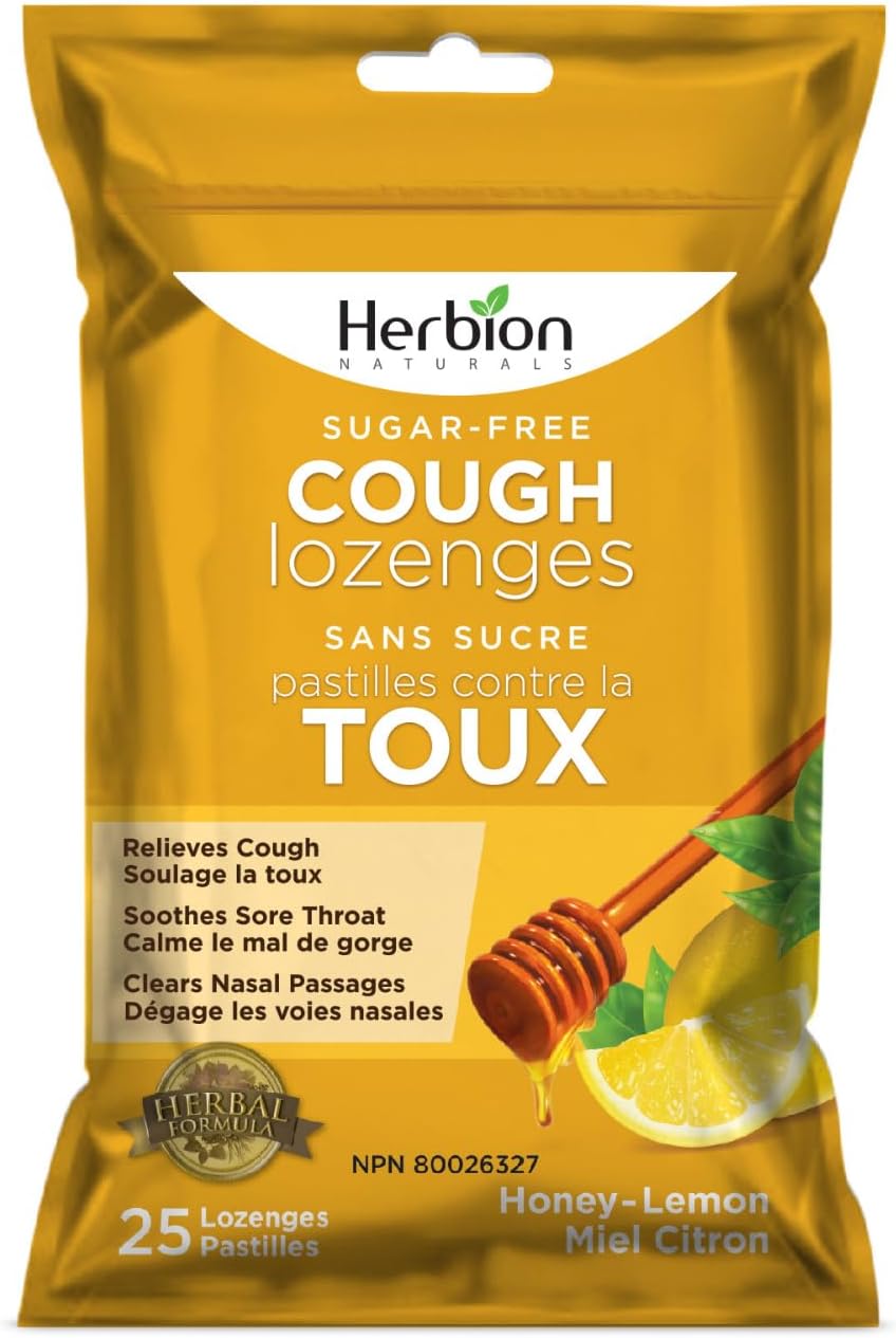 Herbion Naturals 无糖止咳润喉糖,天然蜂蜜柠檬味,25 粒润喉糖,缓解咳嗽和鼻塞,舒缓咽喉痛,适用于成人和 12 岁及以上儿童,1 包