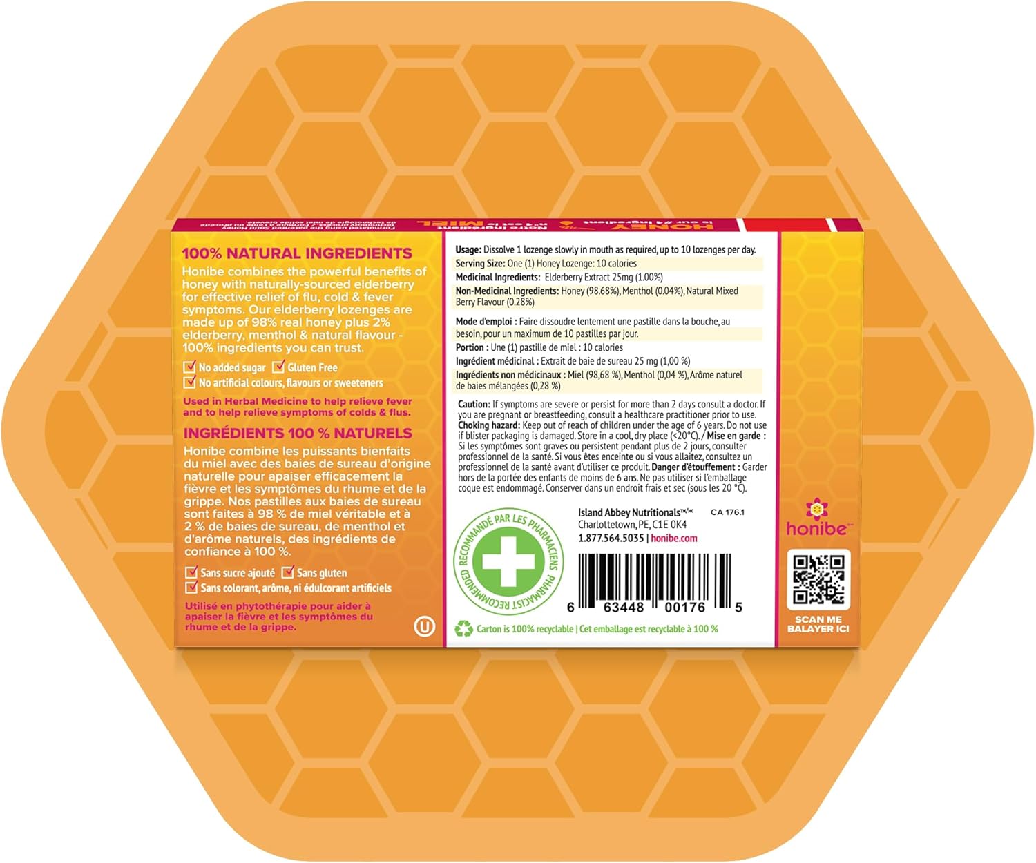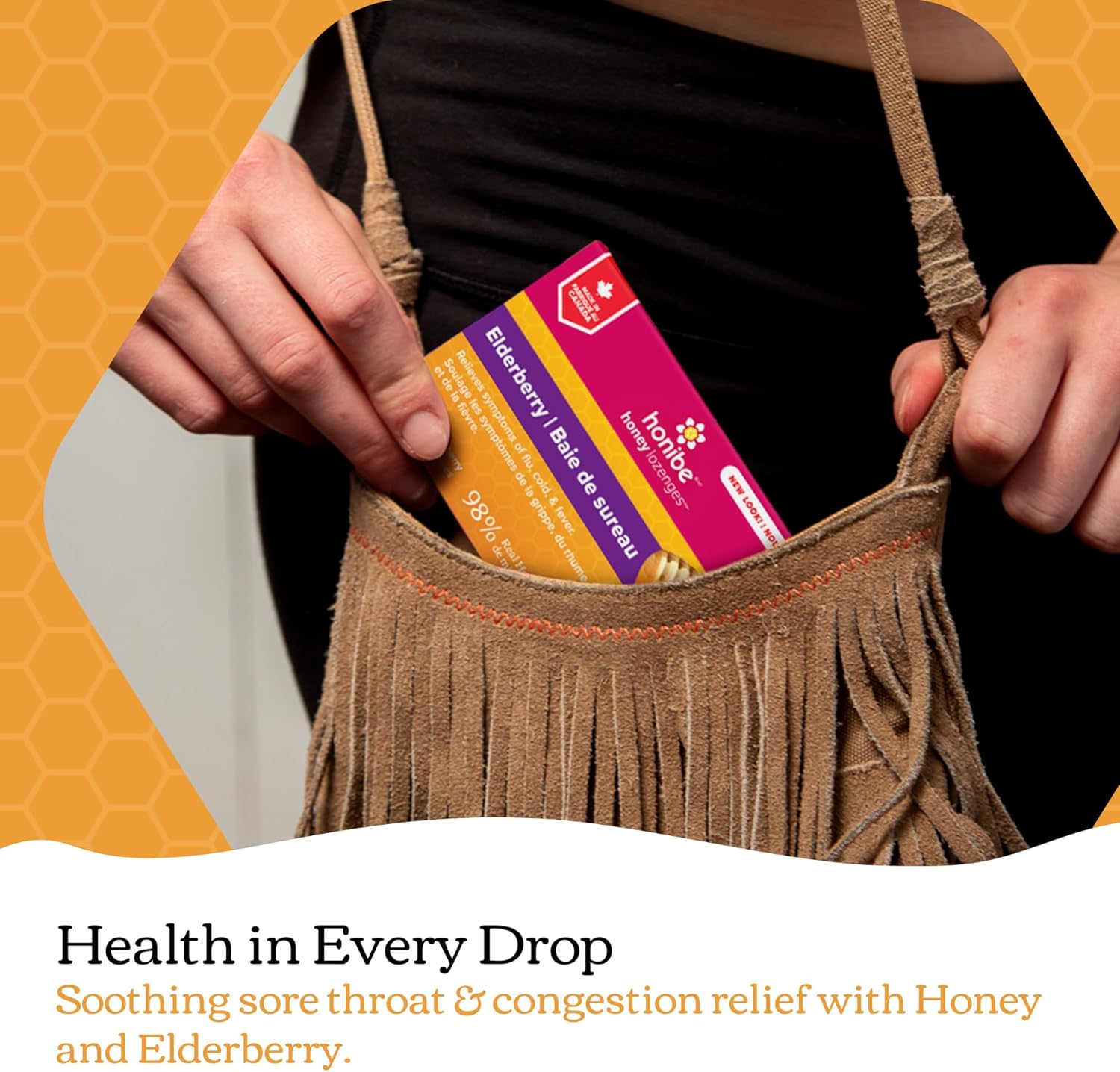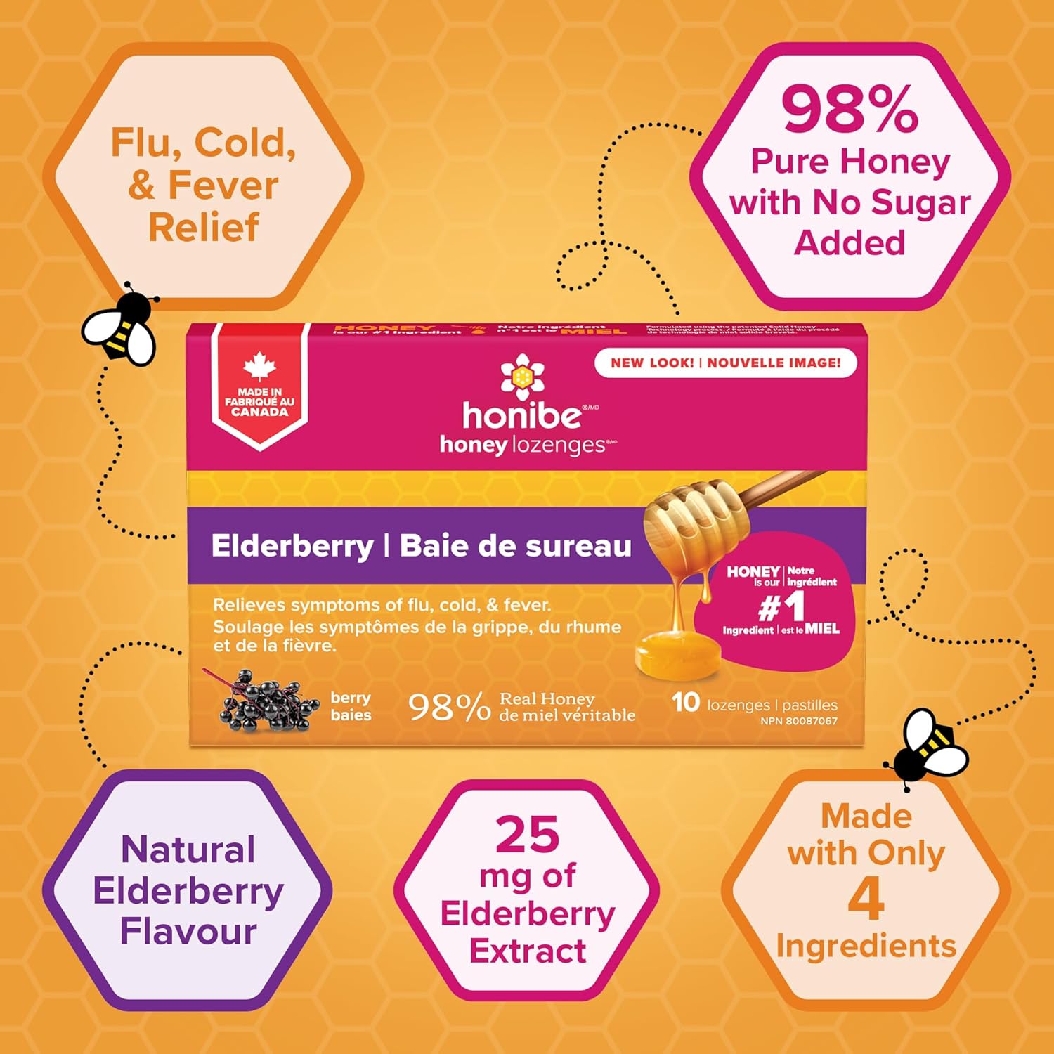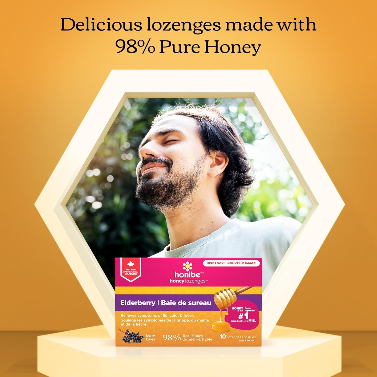 Honibe 100% 纯蜂蜜润喉糖,加拿大制造,缓解痰液和咳嗽,含接骨木果,1 包(10 粒润喉糖),天然浆果