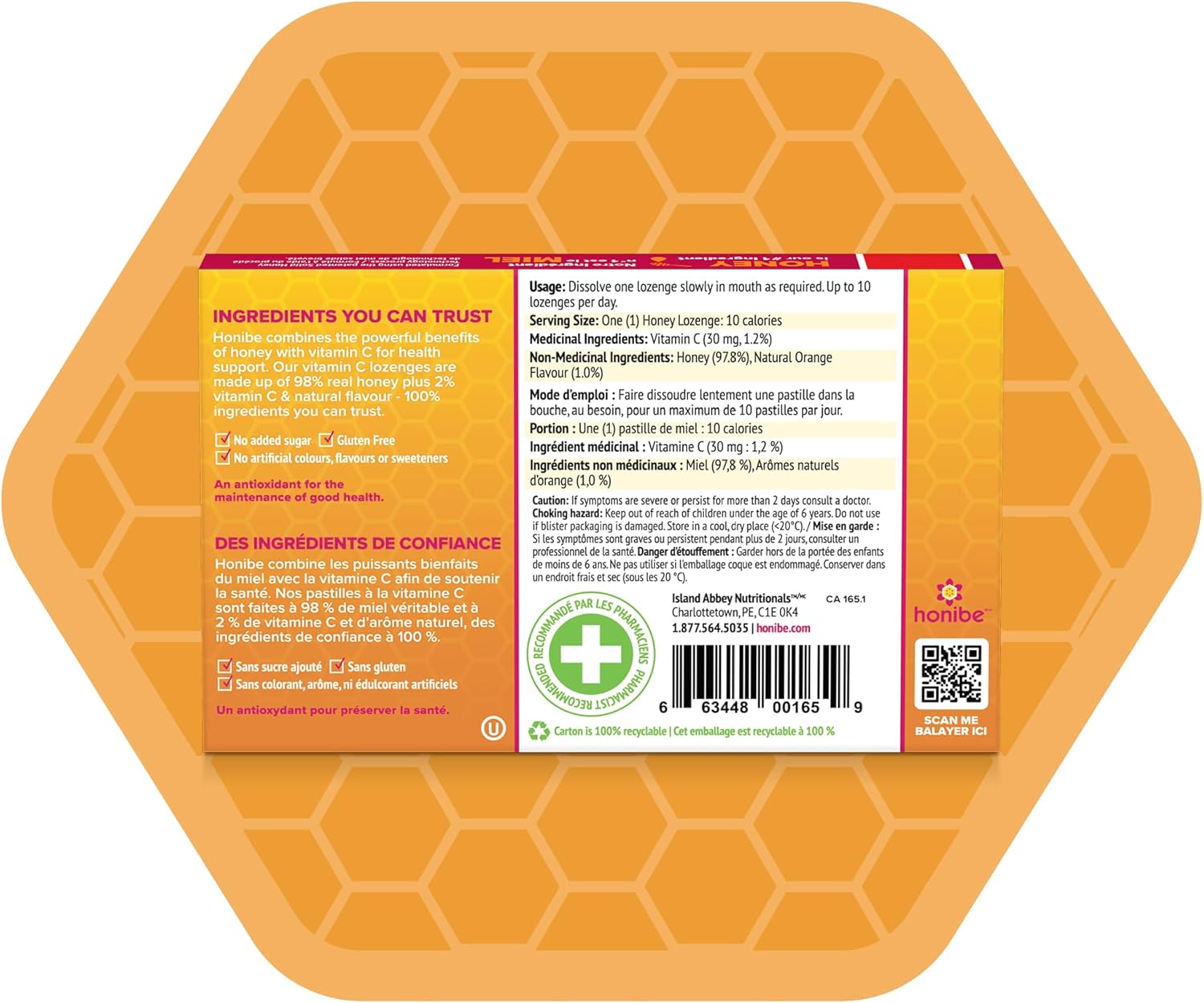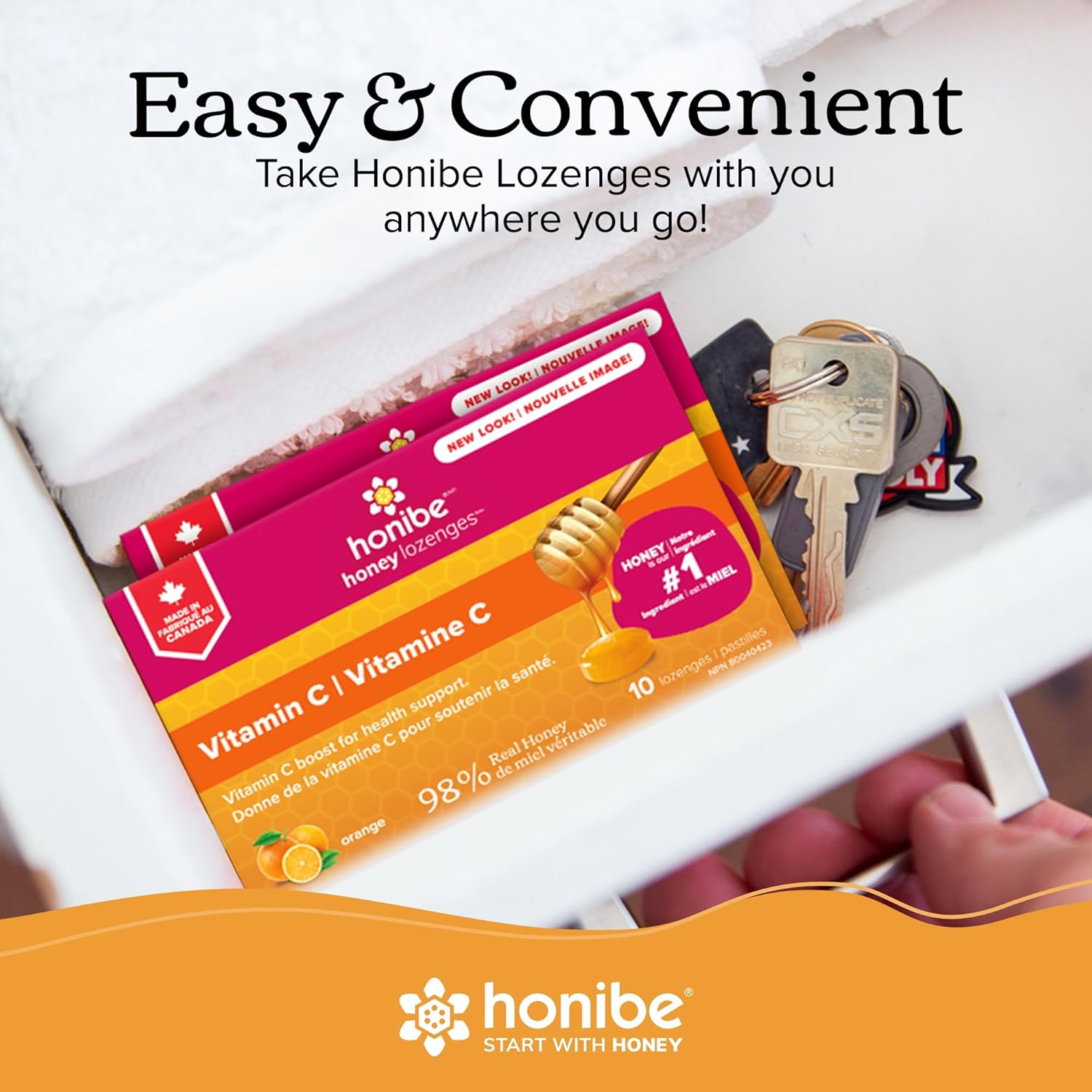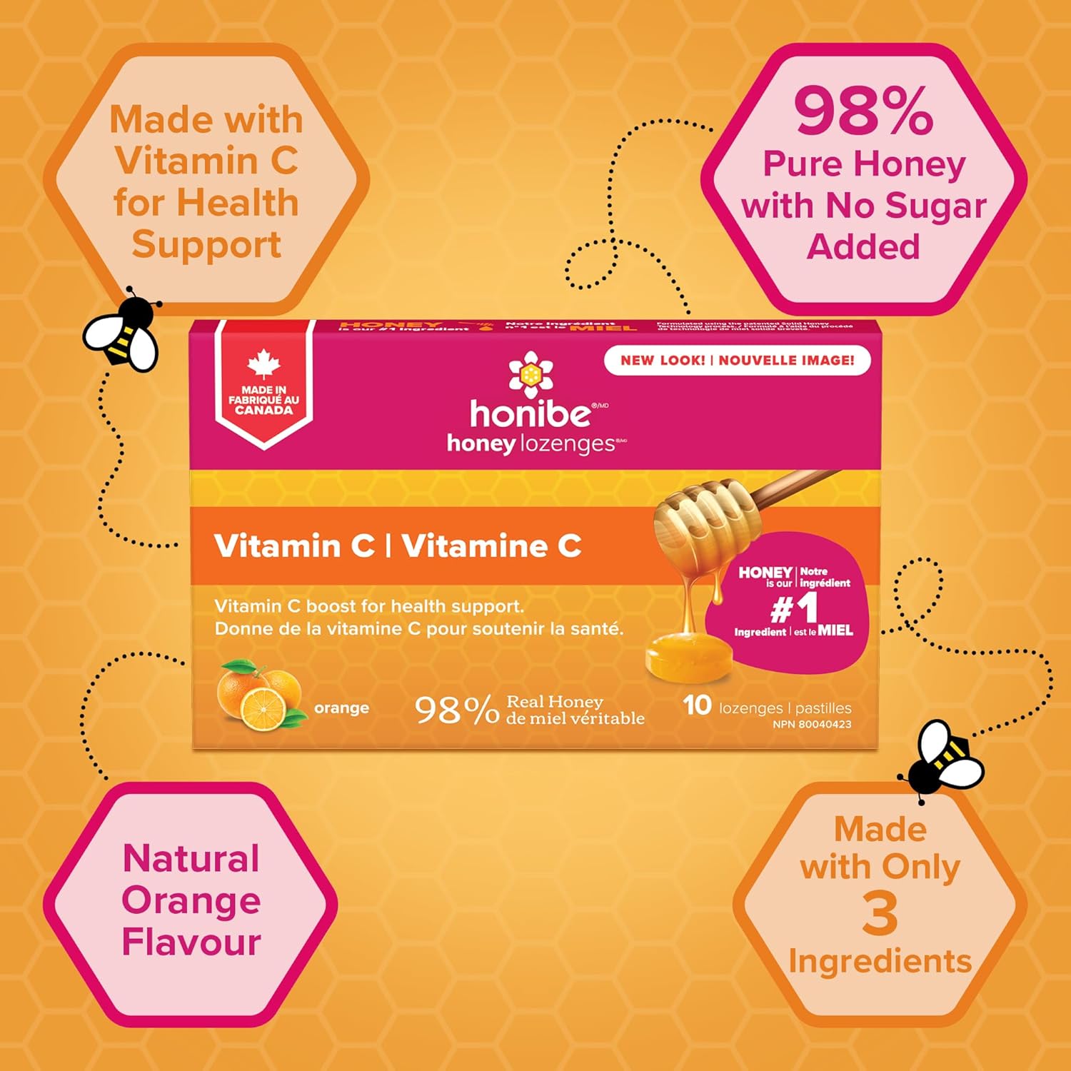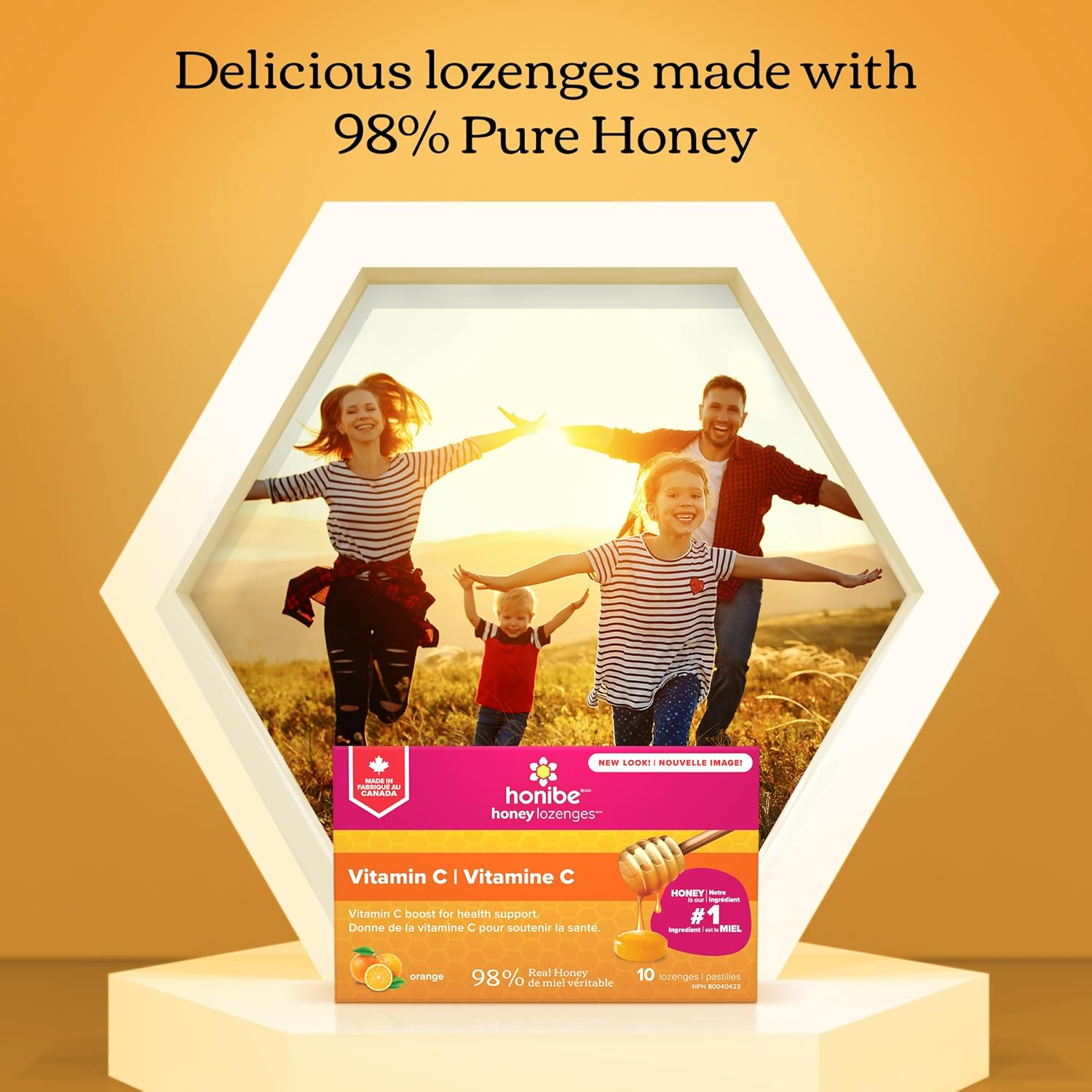 Honibe 100% 纯蜂蜜润喉糖 | 加拿大制造 | 添加维生素 C 以支持健康 | 1 包(10 粒润喉糖)| 天然橙子