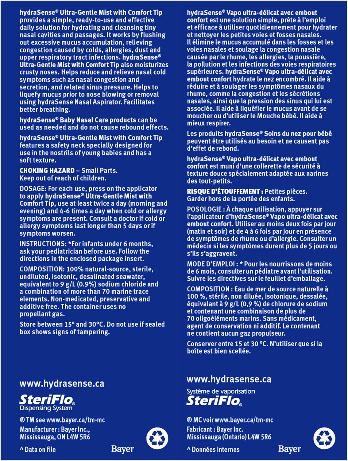 HydraSense 超温和喷雾鼻腔喷雾,婴儿鼻腔护理,100% 天然海水,不含防腐剂,100 毫升 HydraSense 超温和喷雾,配有舒适喷嘴,专为婴儿鼻孔设计。如果您的宝宝因感冒或鼻塞导致鼻腔干燥或堵塞而呼吸困难,请尝试此产品。hydraSense 超温和喷雾有 100 毫升和 210 毫升两种规格。使用方法:每次使用时,按压涂抹器 1-2 秒钟以喷洒 hydraSense 超温和喷雾。每天至少使用两次(早上和晚上),或出现感冒或过敏症状时每天使用 4 至 6 次。hydraSense 婴儿鼻腔护理产品是一种有效且易于使用的方法,可舒适地清洁鼻腔并促进擤鼻涕。含液体的产品采用100%天然来源、无菌、未稀释的海水制成,该海水独家取自法国圣马洛湾——以其强劲的海流而闻名,富含氧气、天然矿物盐和微量元素。生产过程中,海水淡化至最佳水平,以保留海水的清洁功效。hydraSense婴儿鼻腔护理产品不含药物成分,不含防腐剂,可每天使用多次,清洁鼻腔。为确保本产品适合您,请务必阅读并遵循标签说明。HydraSense温和喷雾鼻腔喷雾,每日鼻腔护理,100%天然来源海水,不含防腐剂,100毫升。hydraSense温和喷雾鼻腔喷雾专为敏感鼻腔人士以及首次使用者设计,适用于出现过敏(季节性或全年性)或感冒引起的鼻腔症状。它还可以滋润和清洁干燥的鼻腔。经临床验证,它有助于减轻和缓解鼻塞、鼻涕分泌以及相关的鼻窦压力。hydraSense 温和喷雾采用 100% 天然未稀释海水制成,有 100 毫升和 210 毫升两种规格。为确保本产品适合您,请务必阅读并遵循标签说明。