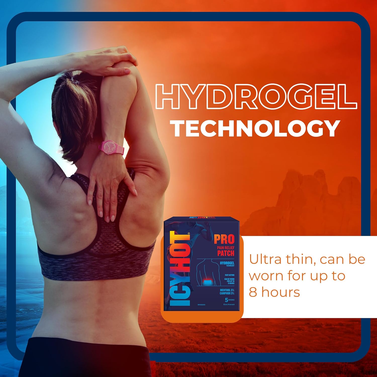 Icy Hot Pro 肌肉疼痛贴片可快速、精准地缓解肌肉和关节疼痛、轻微背痛、拉伤和扭伤,让您重回运动状态。这款 Icy Hot 贴片采用 5% 薄荷醇和 3% 樟脑的止痛配方,双重功效,直击肌肉和关节疼痛的根源。背痛缓解始于舒缓的冰凉感,缓解疼痛,随后温暖的触感将疼痛缓解。更棒的是,这款 Icy Hot 止痛贴片采用先进的水凝胶技术,接触时带来清凉感(1)。这款超薄舒适的弹性肌肉疼痛贴片可轻松贴在衣物内,最长可持续使用 8 小时。5 片装的止痛贴片非常适合旅行或居家使用,可缓解背部和颈部疼痛,或在任何需要的时候使用。Icy Hot 提供多种背痛缓解产品,以满足您的需求。为确保本产品适合您,请务必阅读并遵循标签上的说明。(1) 指薄荷醇的清凉效果。