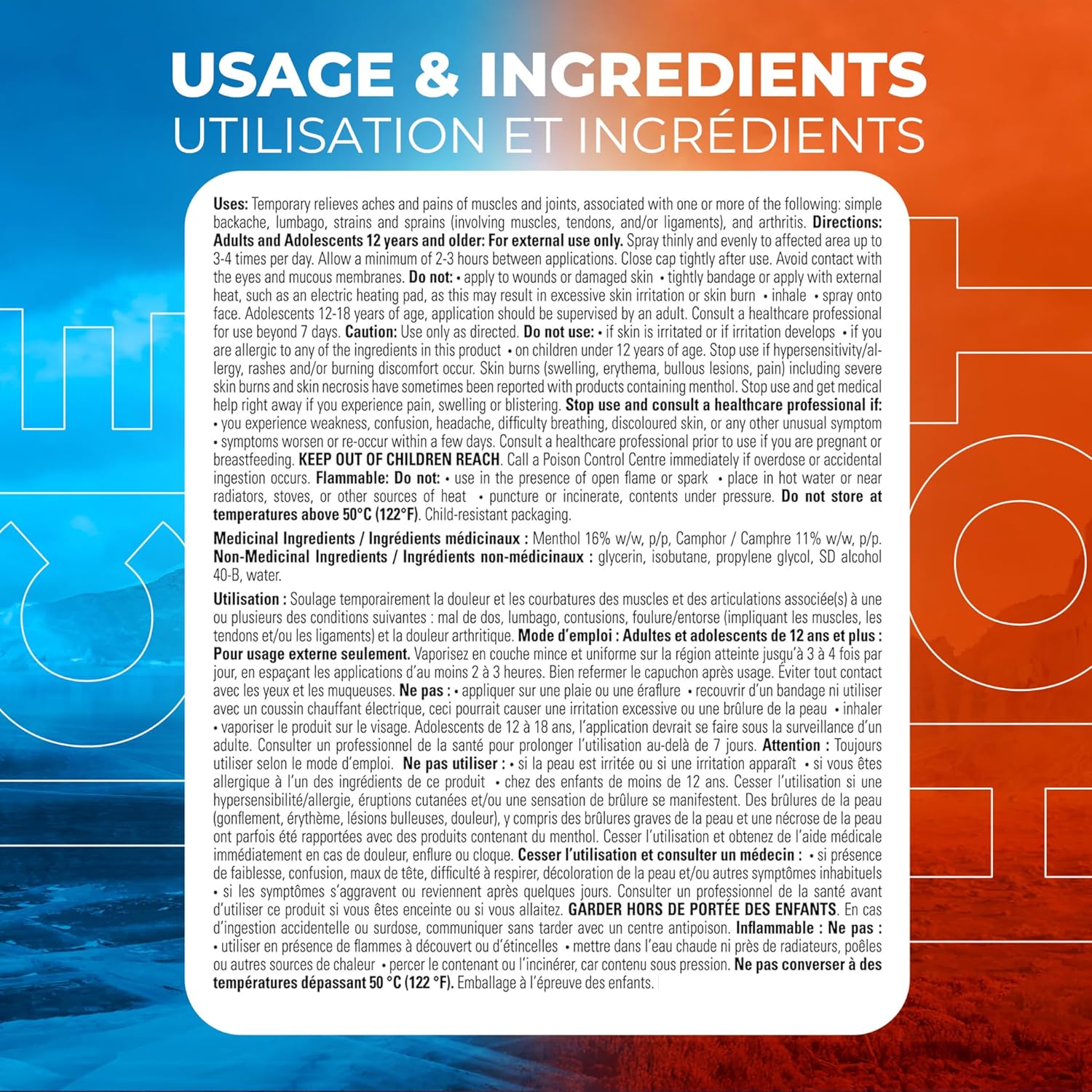 Icy Hot Pro 止痛干喷是一款强效(1)的肌肉止痛喷雾,旨在快速起效,让您重回赛场。这款干喷喷雾一接触皮肤便开始起效,并迅速被皮肤吸收,有效缓解关节炎疼痛、轻微背痛、拉伤和扭伤带来的肌肉和关节疼痛。它含有16%的薄荷醇和11%的樟脑,带来冰凉的触感,缓解疼痛,随后带来温暖的放松感。更棒的是,这款喷雾喷嘴设计让您可以轻松地将 Icy Hot 喷雾喷到难以触及的部位,例如腰痛。每天在患处涂抹薄薄一层,不超过3至4次,即可有效缓解关节和肌肉疼痛。这款118毫升的止痛喷雾非常适合旅行或居家使用,可随时缓解关节炎疼痛和颈部疼痛。为确保 Icy Hot Pro 止痛干喷适合您,请务必阅读并遵循标签上的说明。 Icy Hot 提供多种背痛缓解产品,以满足您的需求。(1) 产品成分符合加拿大卫生部《抗刺激剂专论》允许的最大含量/强度。