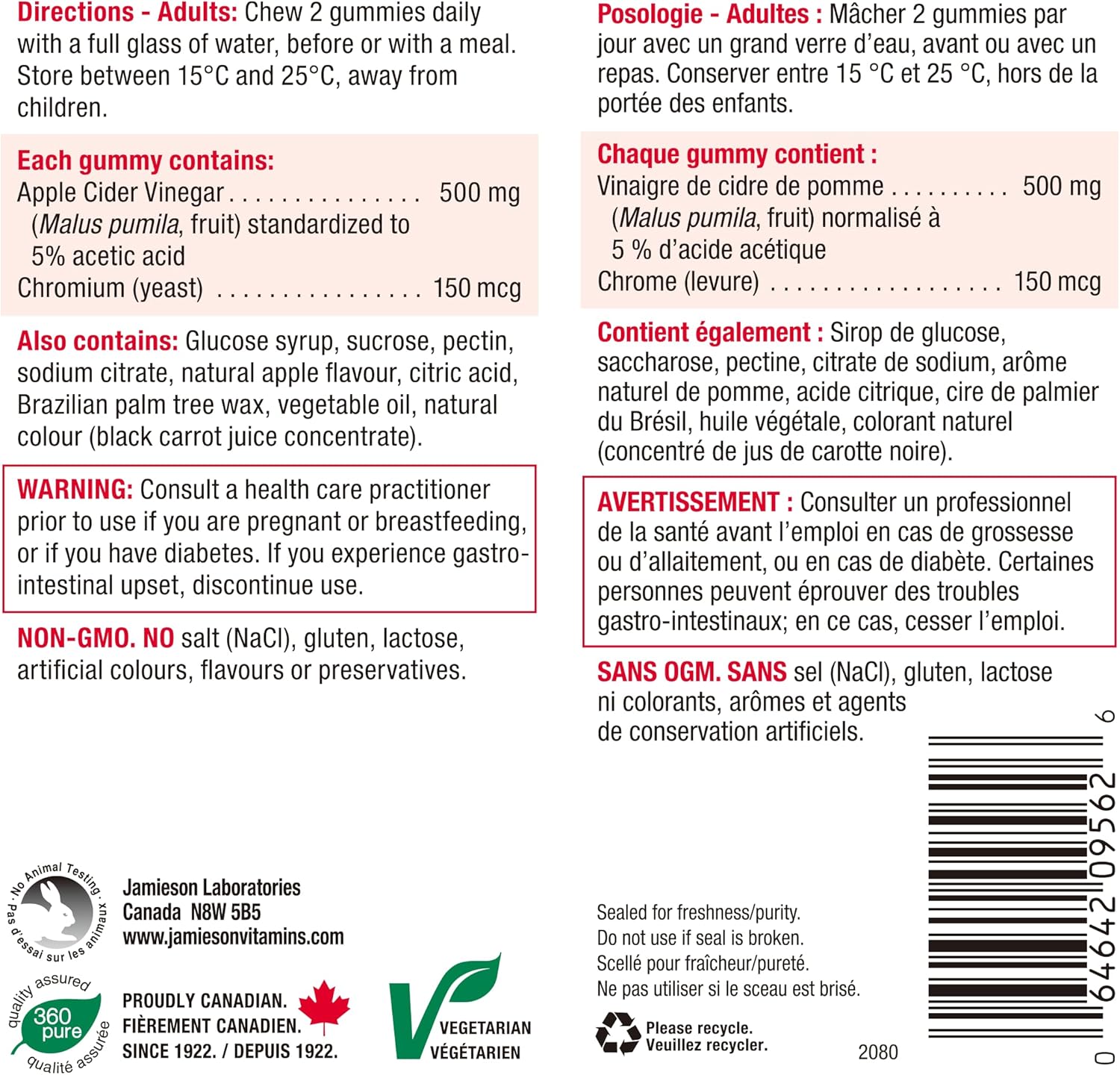Jamieson 苹果醋软糖,含铬,有助于维持正常血糖水平,促进新陈代谢。素食,不含人工色素、香精或防腐剂,红苹果味,60 粒