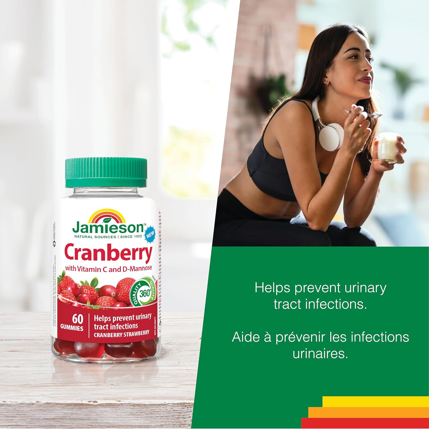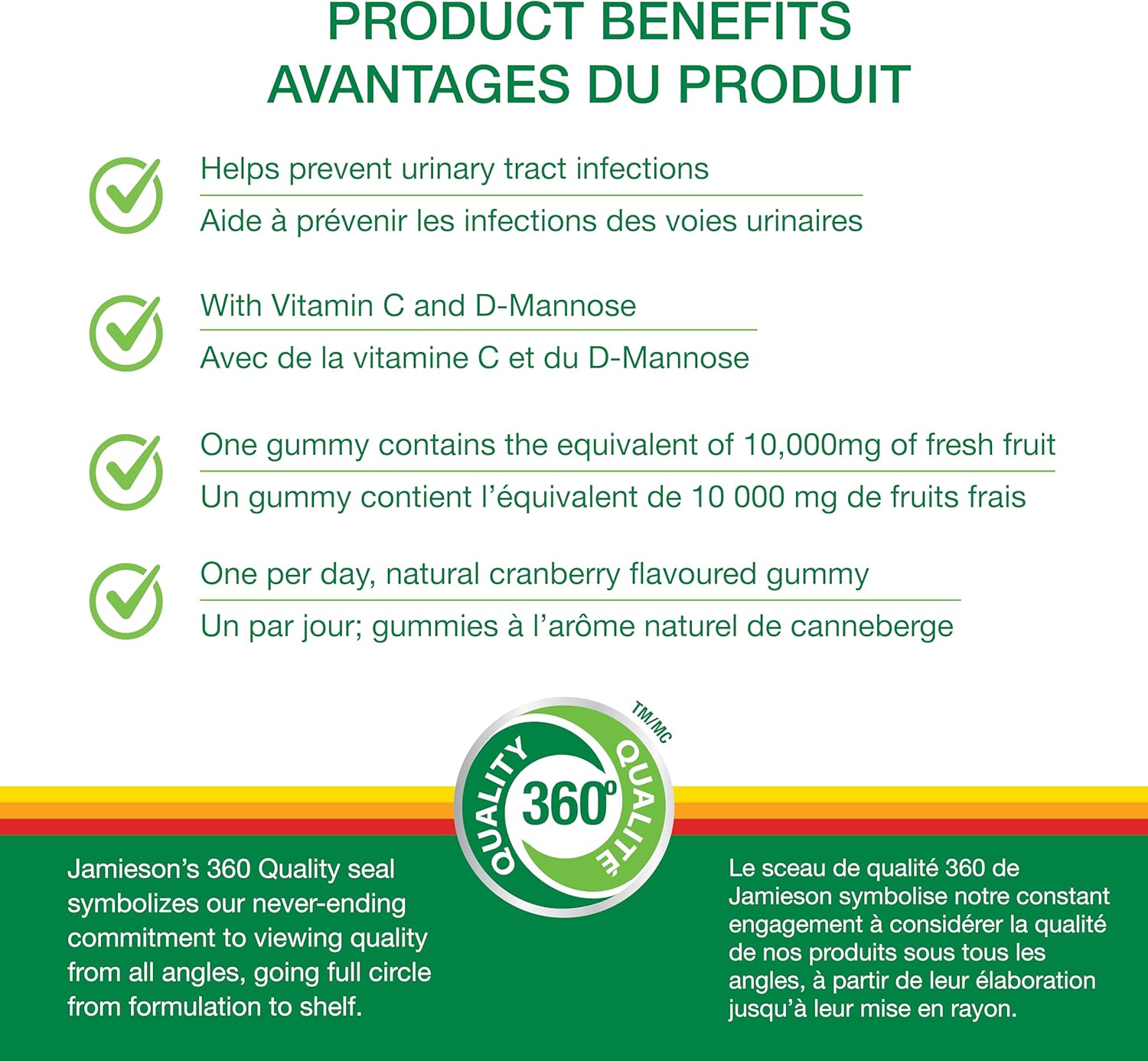 Jamieson's 蔓越莓维生素C和D-甘露糖软糖采用高效蔓越莓提取物配方,有效预防尿路感染。添加维生素C,增强人体免疫功能,是一款双重功效、美味可口、素食友好的软糖。