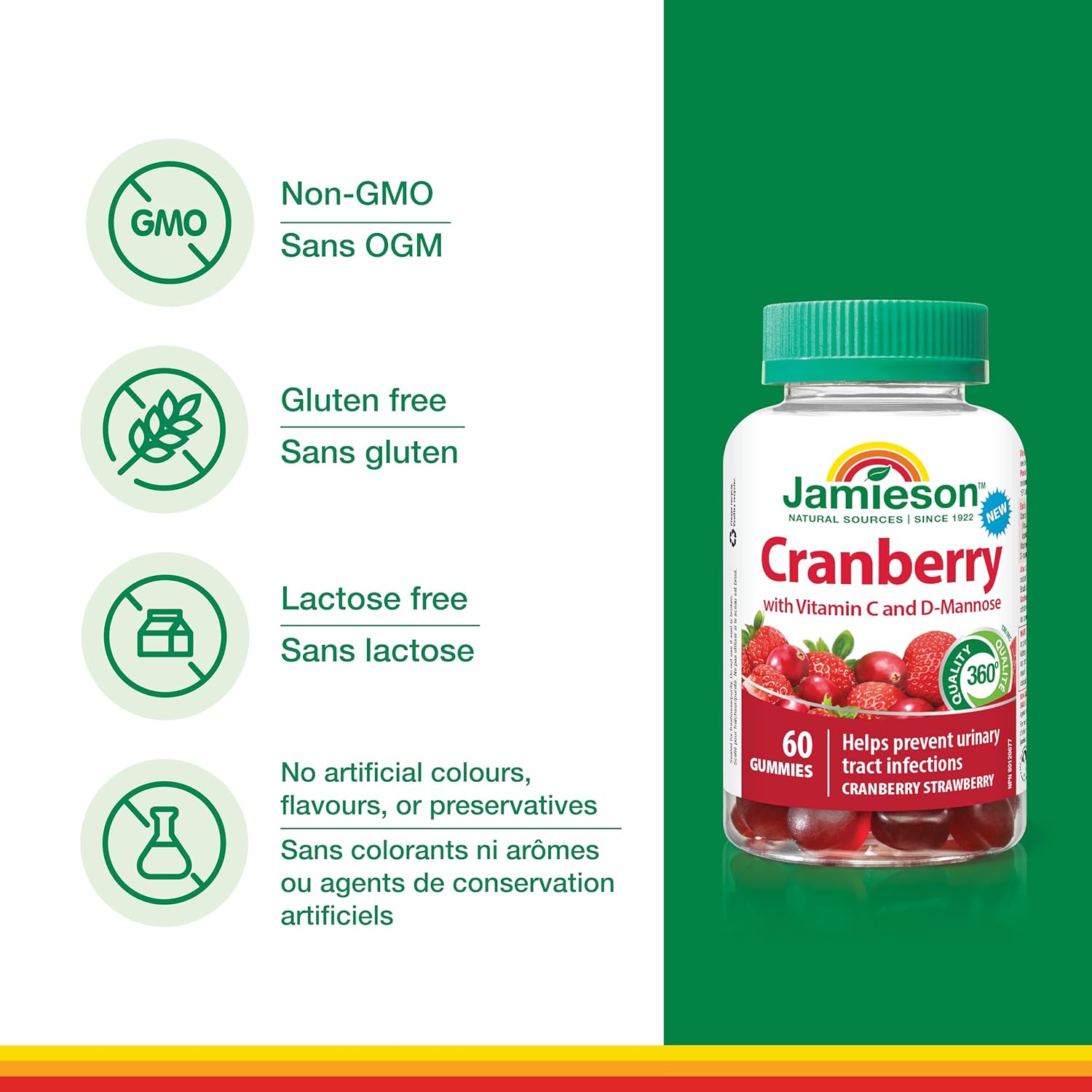 Jamieson蔓越莓10000毫克软糖,蔓越莓草莓味,添加维生素C和D-甘露糖。提供尿路感染防护,增强免疫力,素食,非转基因,不含人工色素、香精或防腐剂,60粒