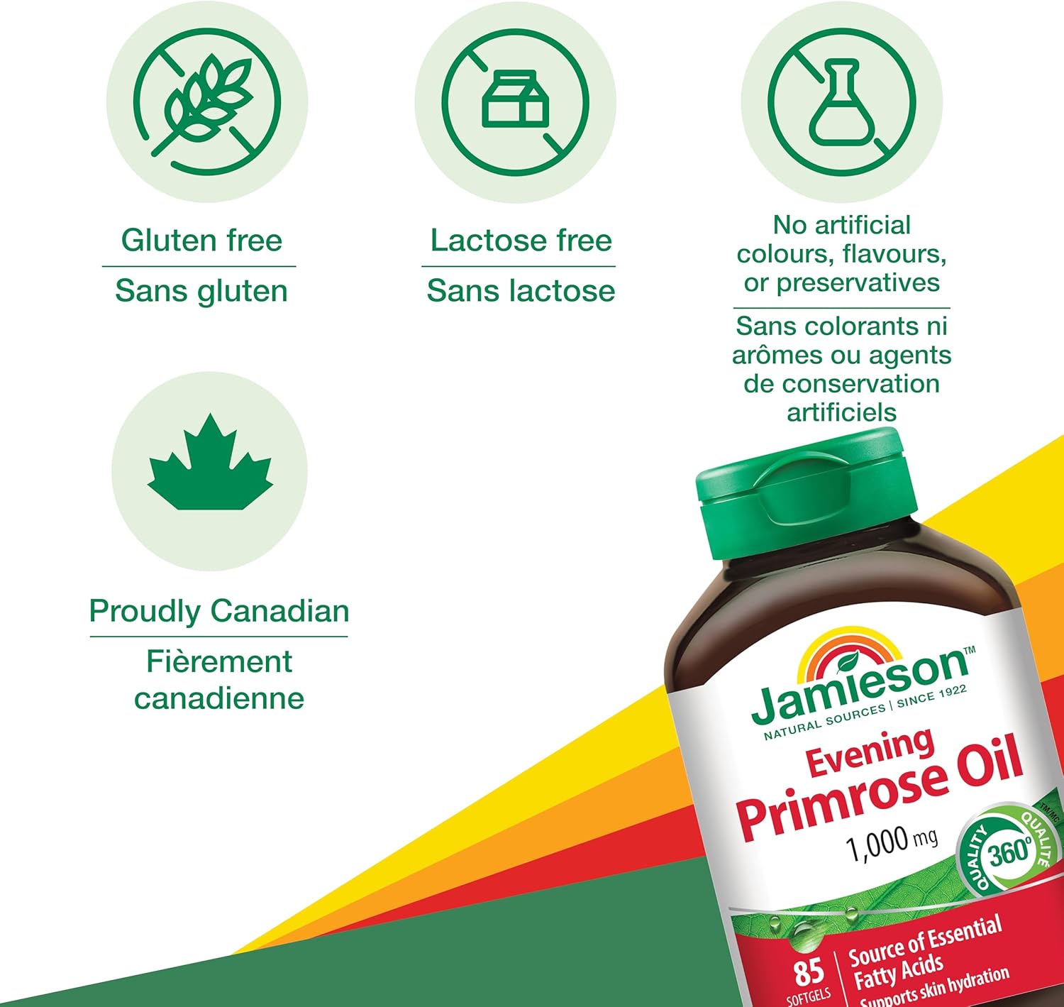 Jamieson 月见草油 1000 毫克,富含 Omega-6,促进肌肤保湿,令肌肤光滑细腻,减轻痤疮症状,并缓解湿疹症状。非转基因,无麸质,85 粒软胶囊,加拿大制造
