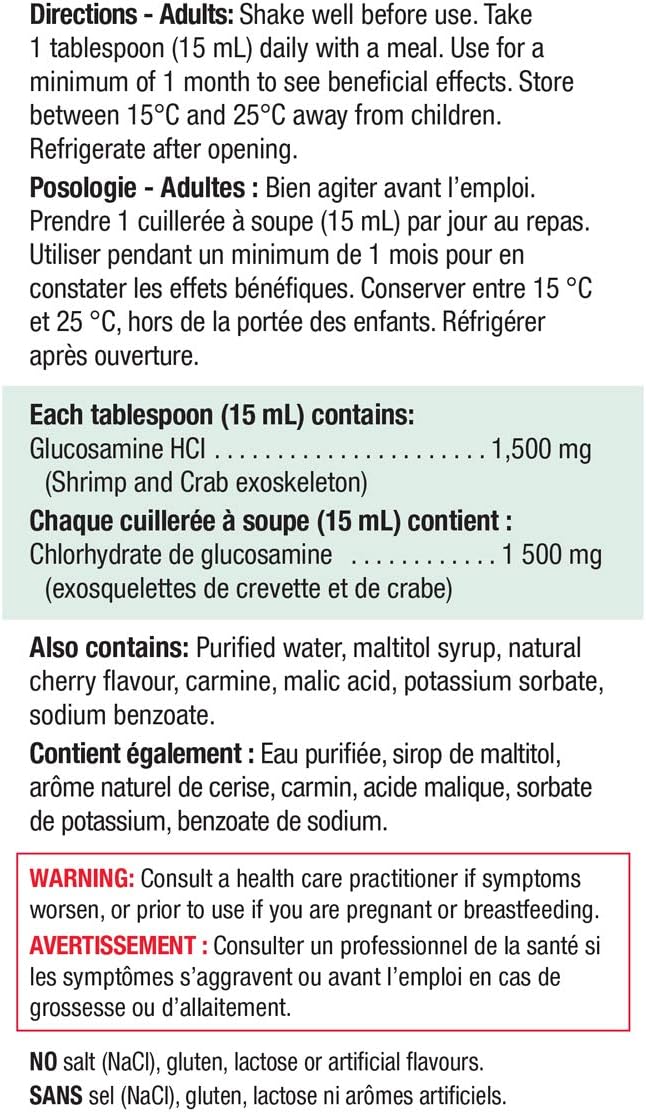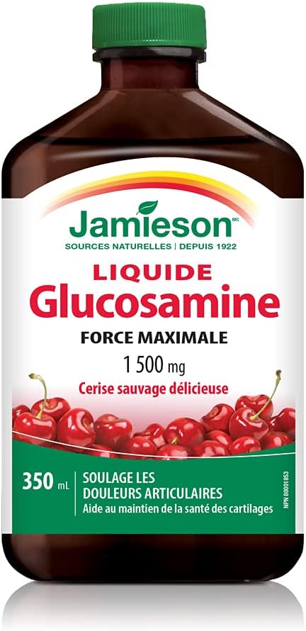 Jamieson 强效葡萄糖胺口服液,1500 毫克,野樱桃味,缓解关节疼痛,支持骨关节炎,并防止软骨退化。不含麸质、乳糖和人工香料,350 毫升,加拿大制造