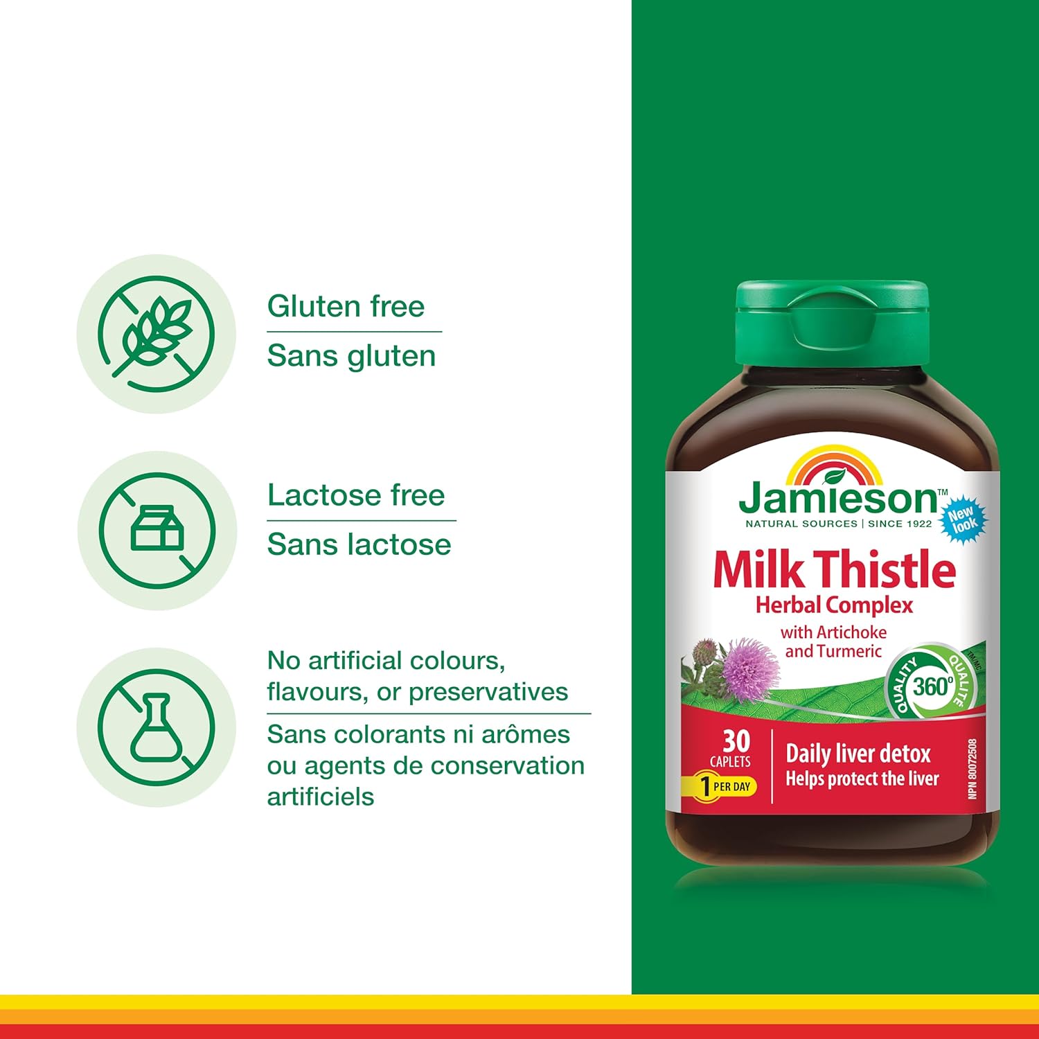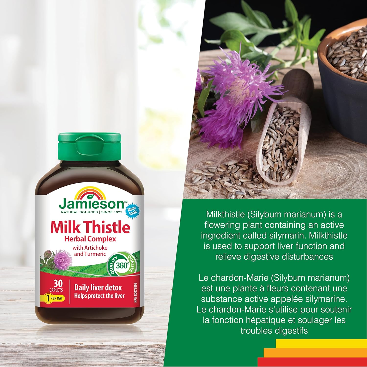 Jamieson 奶蓟草本复合物,蕴含朝鲜蓟和姜黄,有益肝脏和消化系统健康。非转基因,无麸质,30粒素食胶囊,加拿大制造