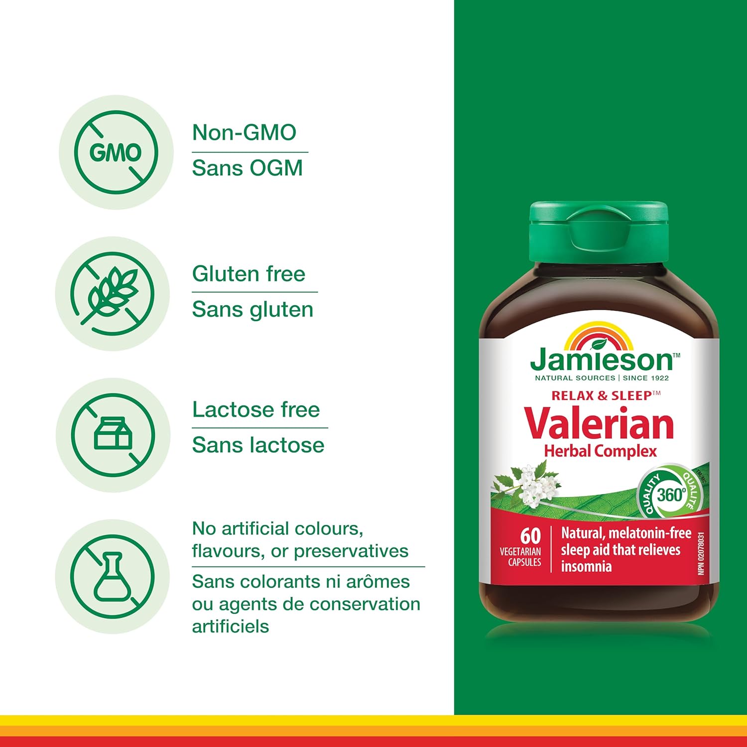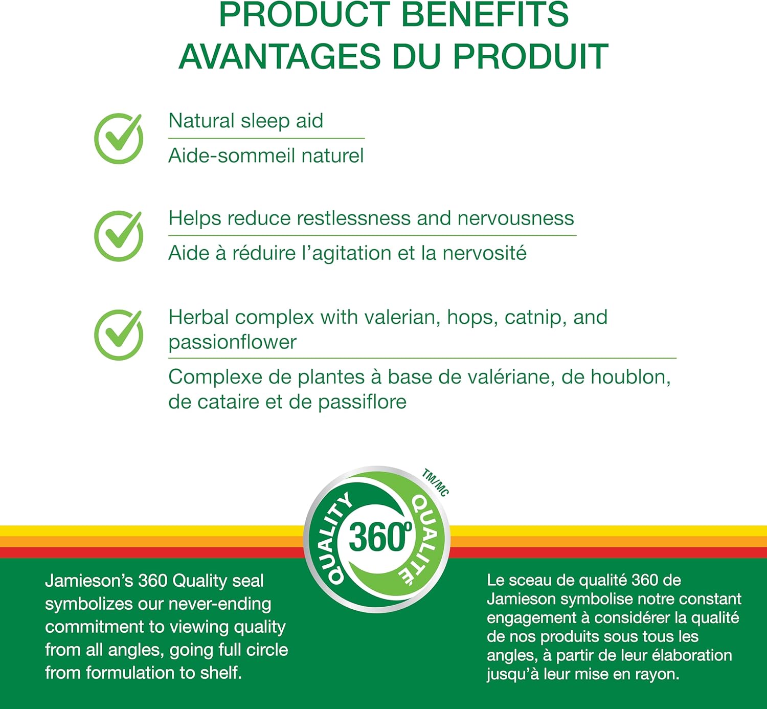 Jamieson 舒缓睡眠草本复合物,含缬草、西番莲和啤酒花,不含褪黑素。天然助眠镇静成分,非转基因,无麸质,60粒素食胶囊,加拿大制造