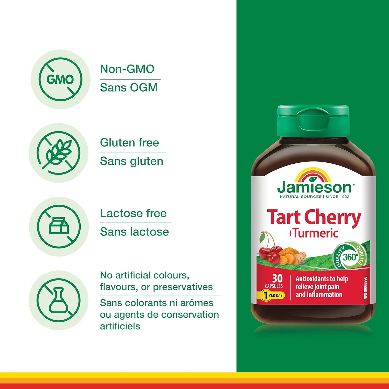 Jamieson姜黄100毫克,含酸樱桃500毫克,天然缓解关节疼痛,消炎助消化。非转基因,30粒素食胶囊,加拿大制造