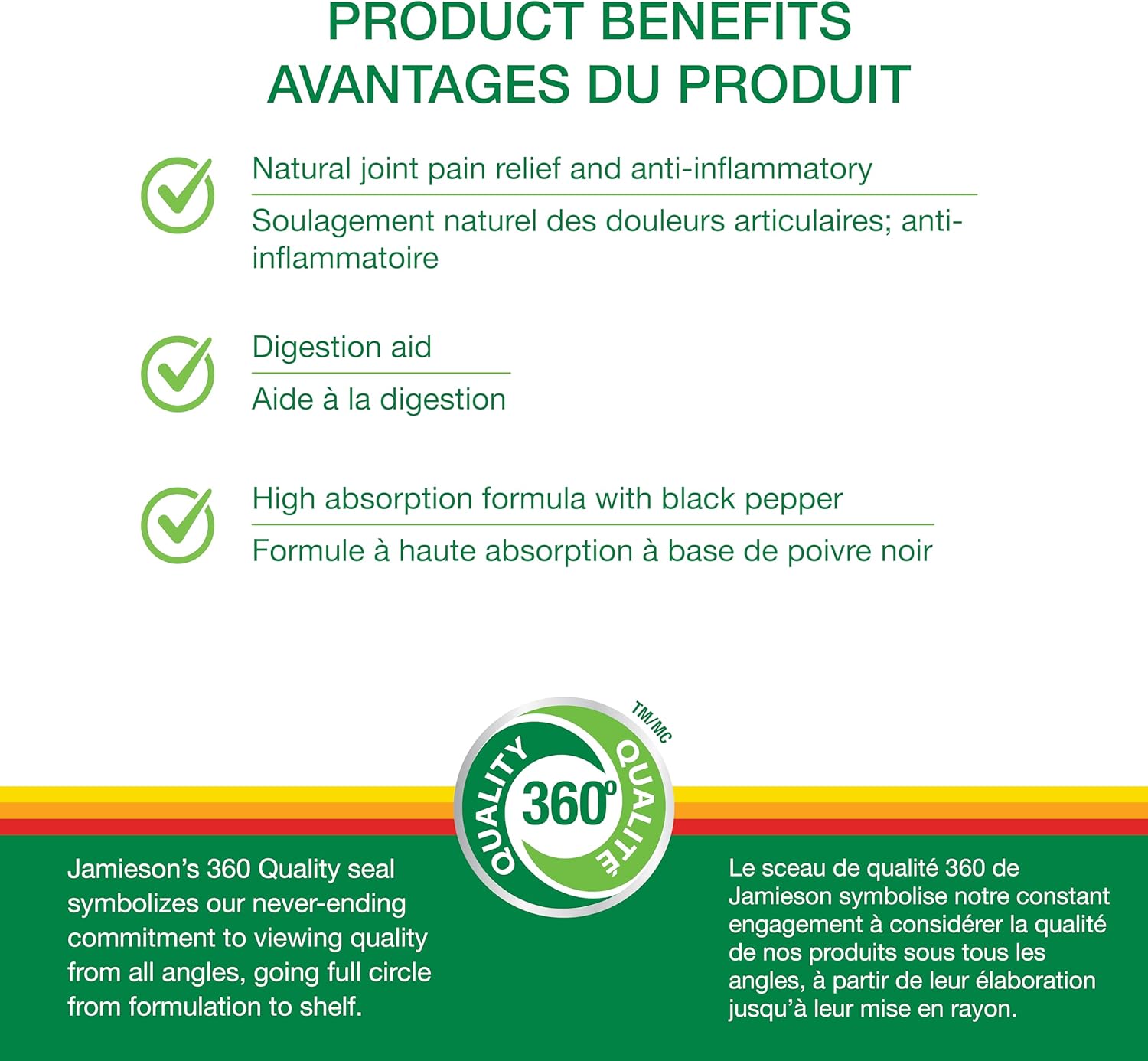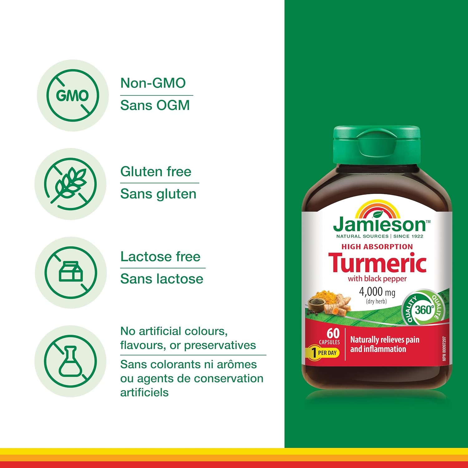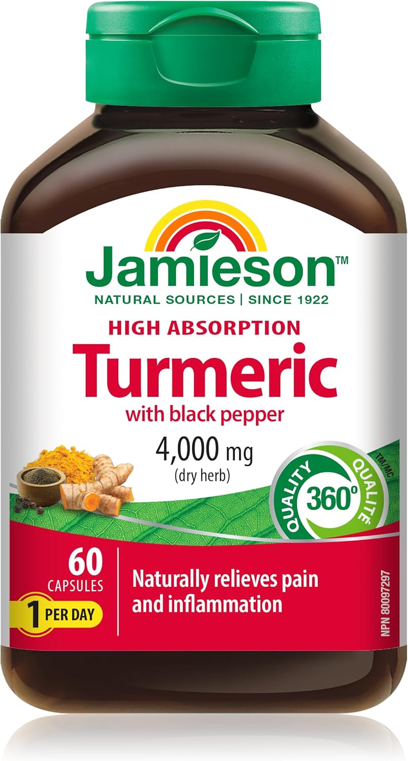Jamieson 姜黄 4,000 毫克,添加黑胡椒,天然缓解关节疼痛,消炎并促进消化。高吸收率,非转基因,无麸质,60 粒素食胶囊,加拿大制造