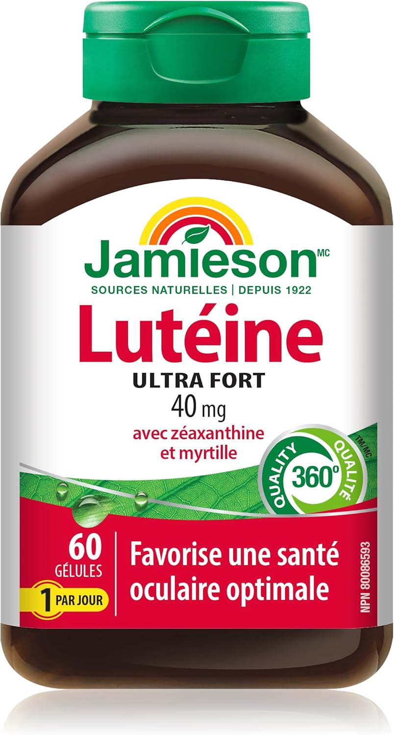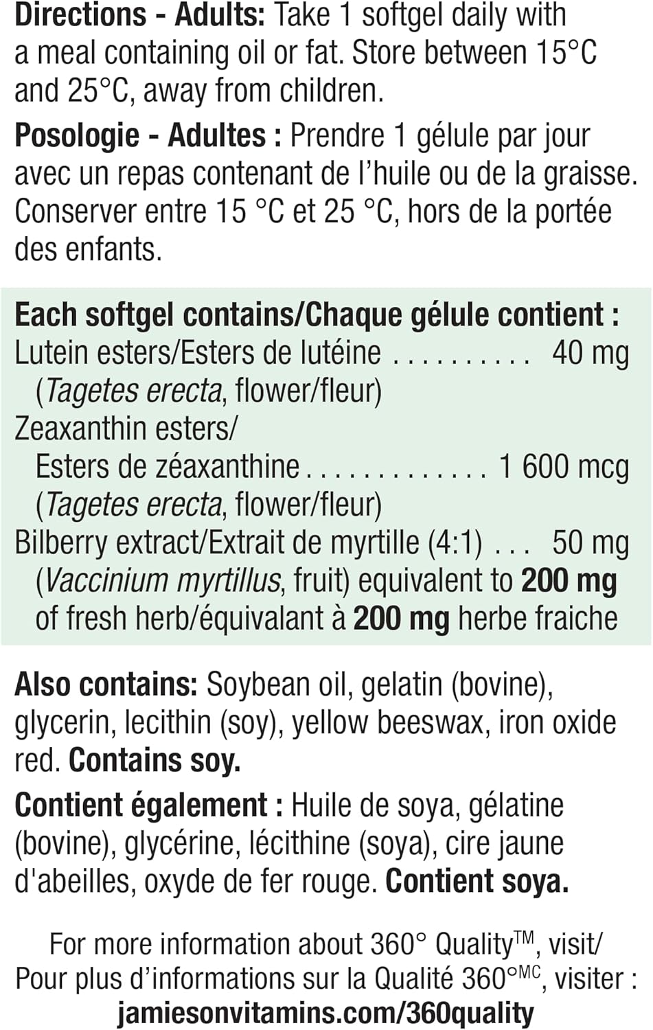 Jamieson 强效叶黄素 40 毫克,添加玉米黄质和越橘提取物,有益于眼部健康,并有助于降低患白内障的风险。非转基因,无麸质,60 粒软胶囊,加拿大制造
