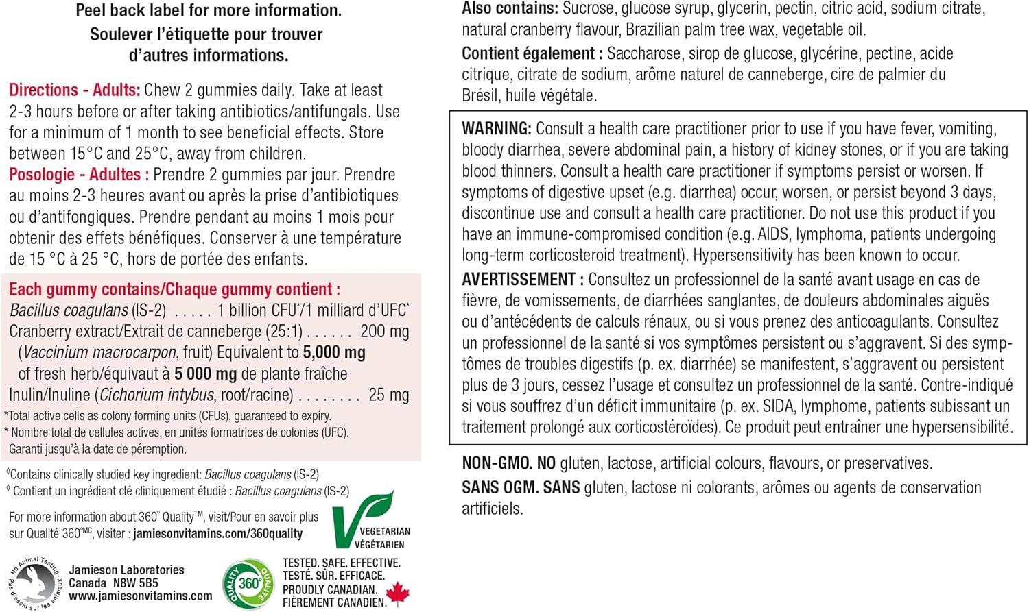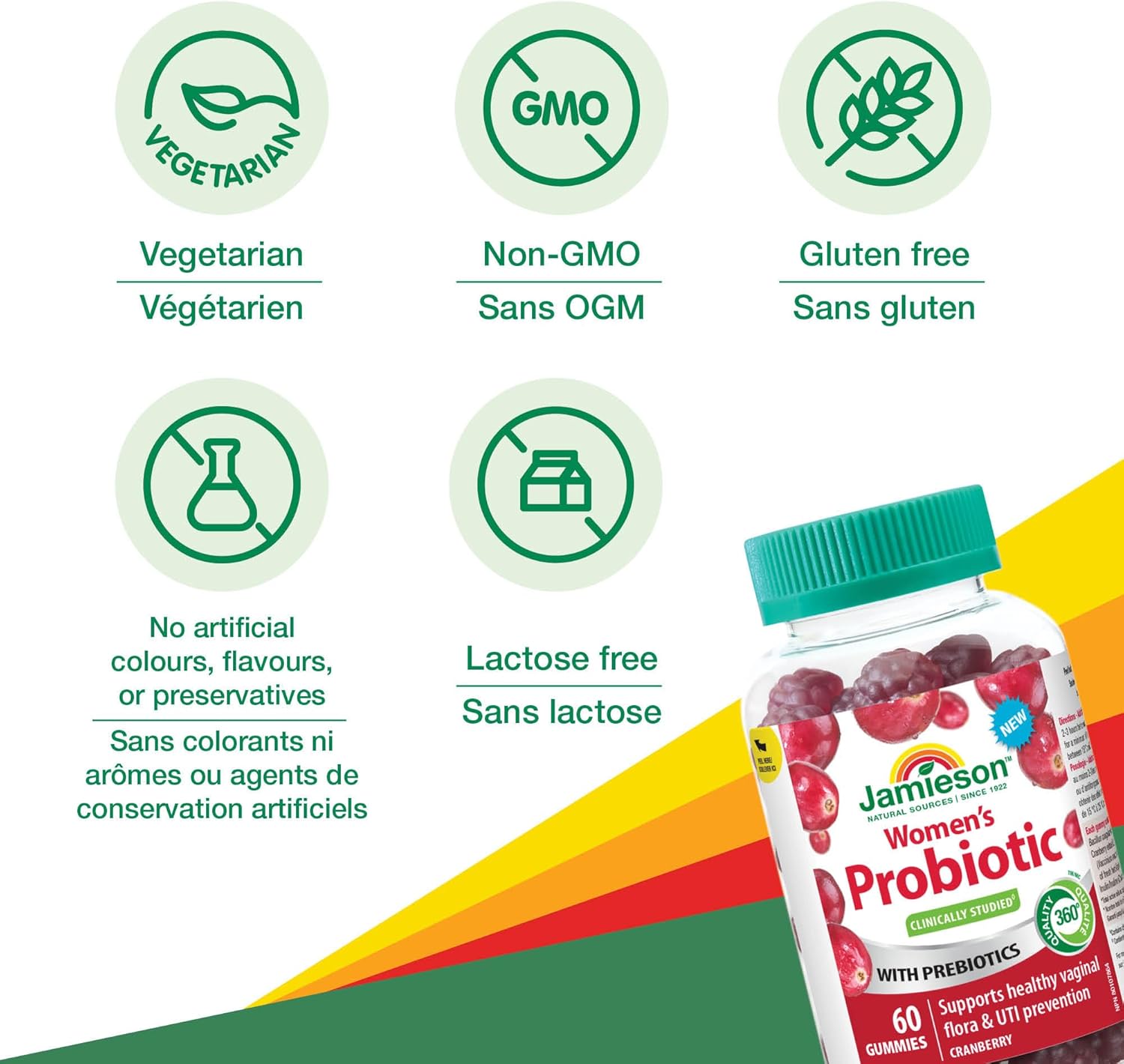 Jamieson 女性益生菌软糖,含蔓越莓和益生元,有助于维持健康的阴道菌群和微生物群,预防尿路感染,并促进消化系统健康。不含人工色素、香精或防腐剂,蔓越莓口味,60 粒装